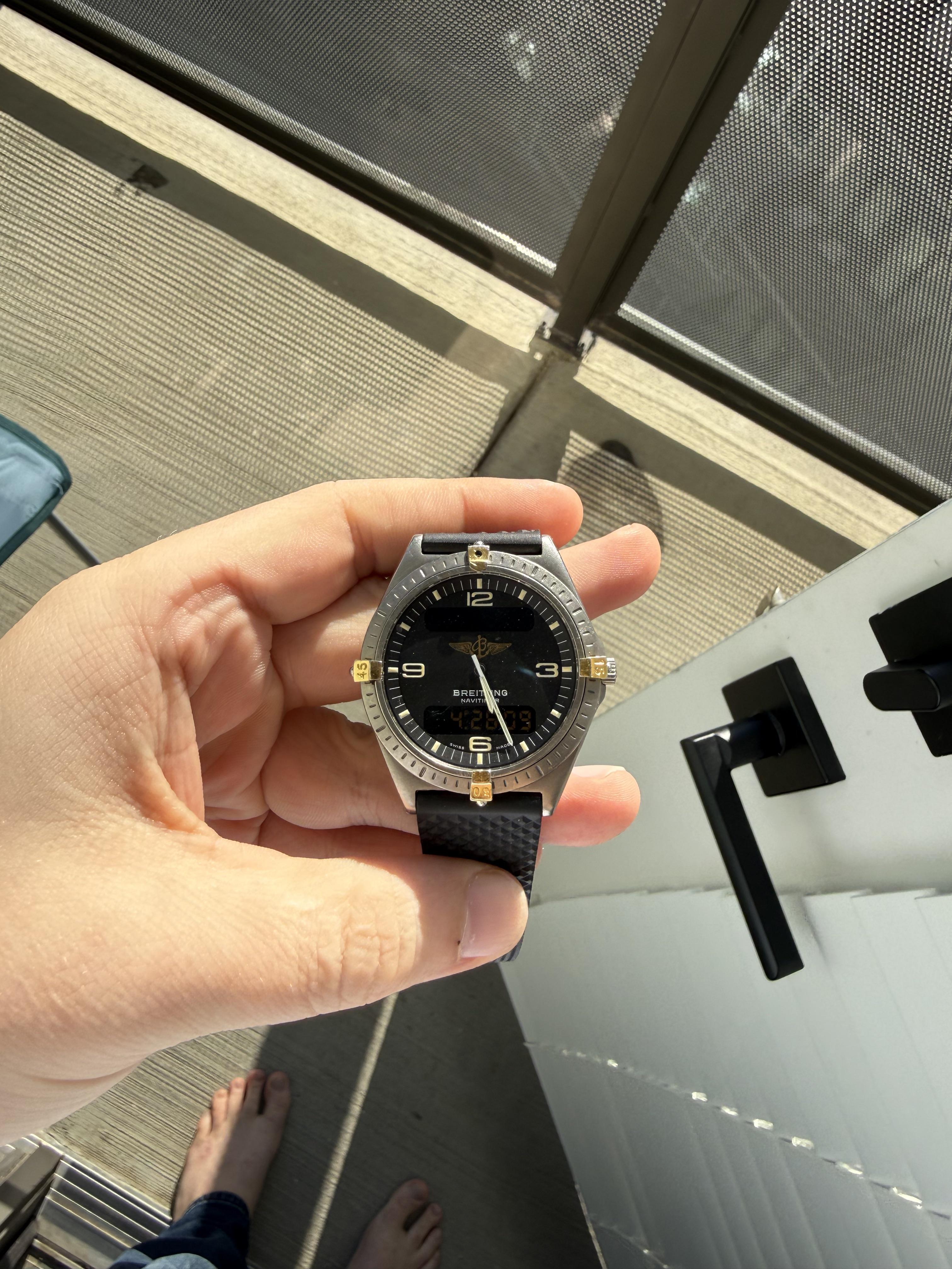 For trade is my Breitling Aerospace Navitimer, ref. F56059, titanium case with gold rider tabs, on a rubber strap. This is a classic Aerospace — ultra lightweight titanium paired with Breitling’s highly functional ana-digi quartz movement. Extremely comfortable on wrist and one of the best true daily-wear tool watches out there. ⸻ Specs • Model: Breitling Aerospace Navitimer F56059 • Case: ~40mm titanium, very lightweight • Bezel: Rider tab bezel with gold-tone accents (pip missing) • Dia...