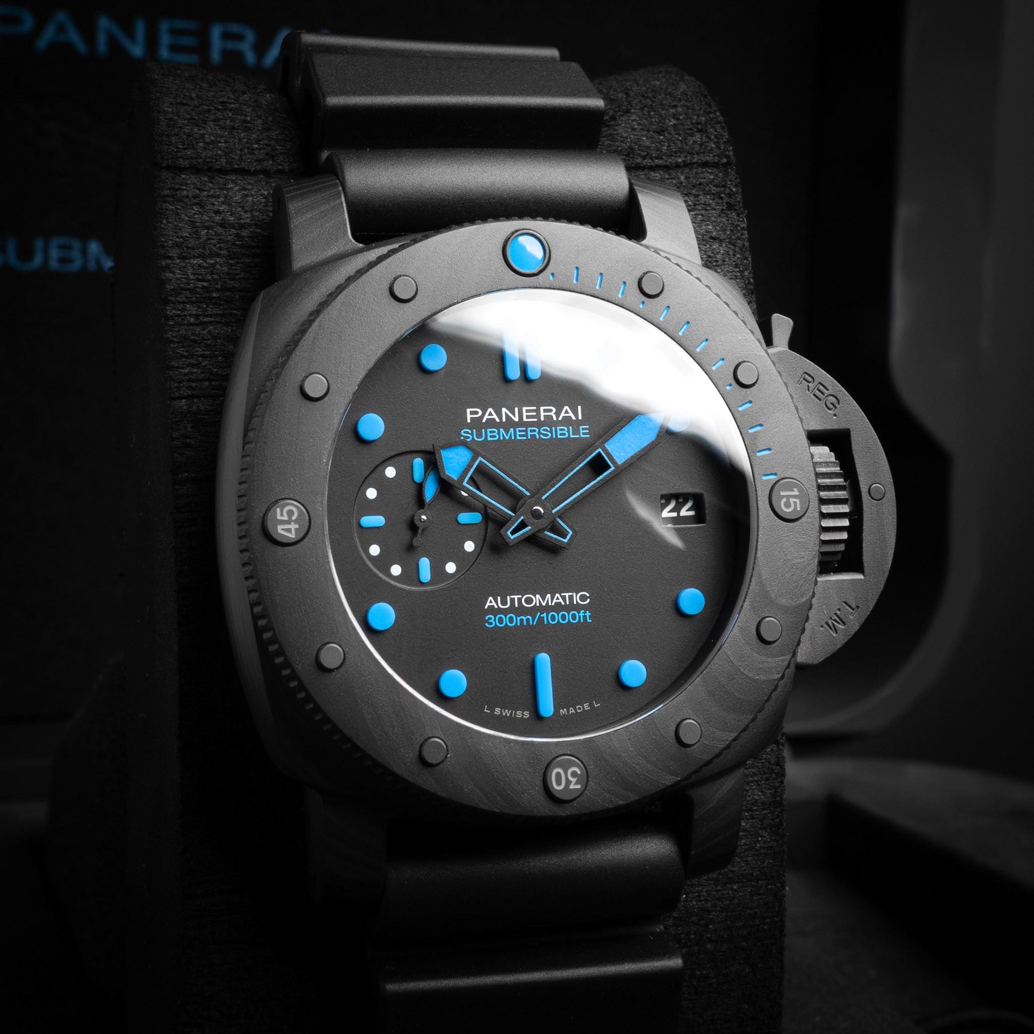 Available now is a super tough piece from Panerai — the Submersible Carbotech 42mm. Built from Panerai's proprietary Carbotech™ — which is lighter than titanium, corrosion-resistant, and looks amazing! This is a very wearable, comfortable, and unique daily! The stealthy black dial and blue hands/indices look stunning with the Carbotech case/bezel. This timepiece comes as a fully loaded kit from 2021 with warranty valid through 2029! Timestamp: https://imgur.com/a/JbsuCua Price: $9899 s...