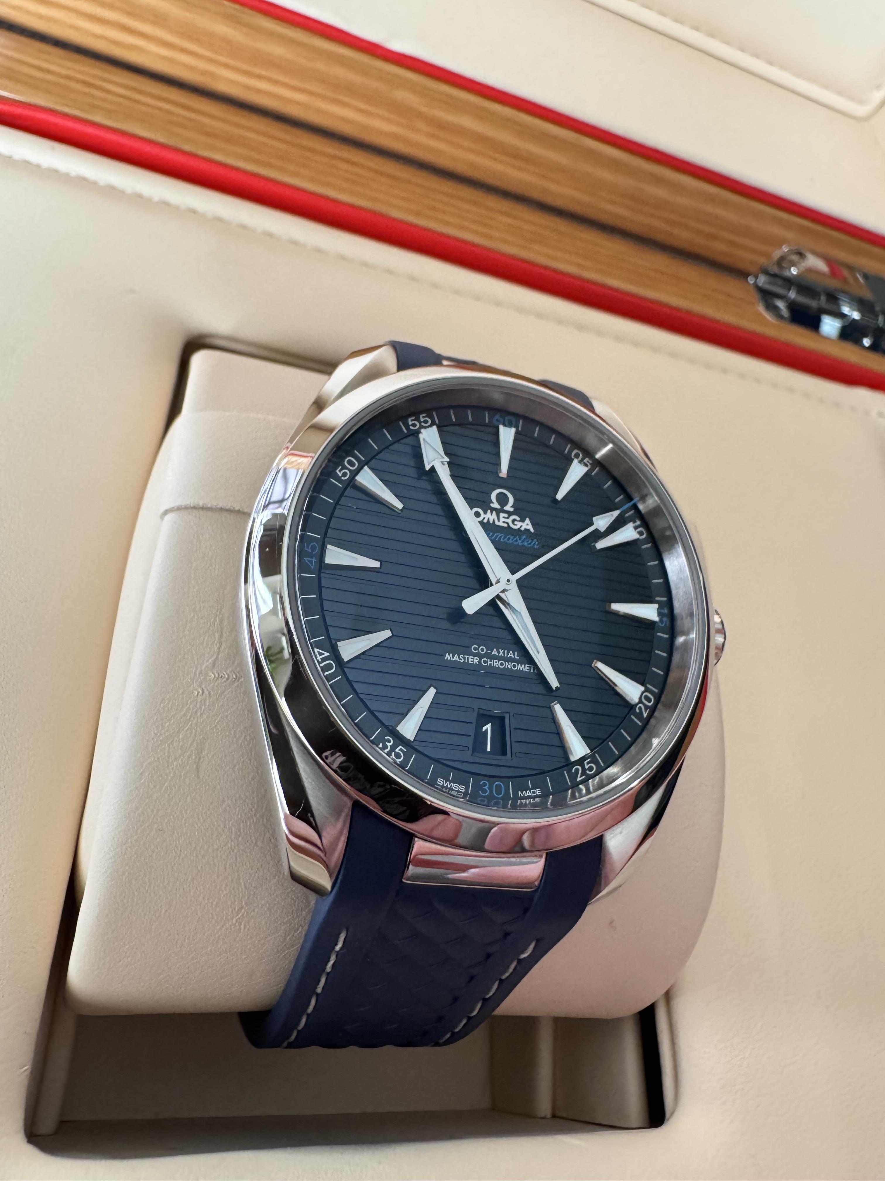 Up for sale is my 41mm Aqua Terra in teakwood blue, reference number 220.10.41.21.03.001. This watch originally came with a steel bracelet, but somewhere in it's life it has been replaced by this beautiful (and comfortable!) OEM blue rubber strap fitted to a deployant clasp. Contains original box & chronometer/pictogram card, however it is missing the warranty card. Watch has been serviced very recently by Omega, and is keeping good time (around +3 sec/day). Was sent for service to fix a misali...