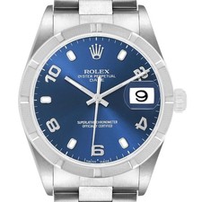 Rolex Date Steel Blue Dial Engine Turned Bezel Mens Watch 15210