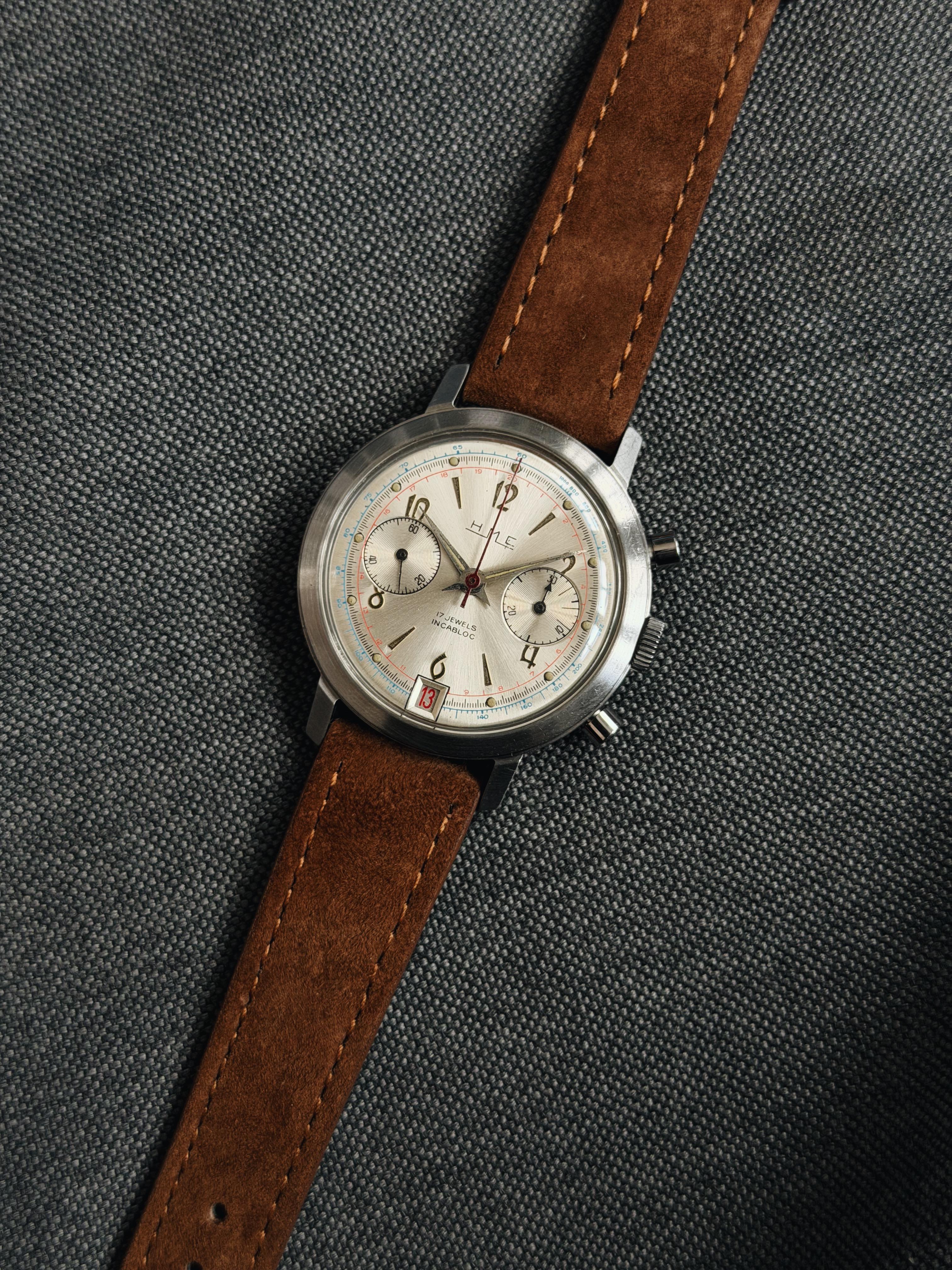 If you’re into vintage Swiss chronographs, buckle up. Up for sale is a stunning 1960s HMC with a silver sunburst dial, date at 6, and a solid stainless steel case – a major upgrade over the chrome-plated watches from the era. Inside you’ll find a Landeron 187 manual wind movement with Incabloc shock protection. The watch was recently oiled and cleaned, so the movement is running strong and the chronograph snaps back to zero exactly as it should. **Condition:** Beautiful vintage condition. The ...