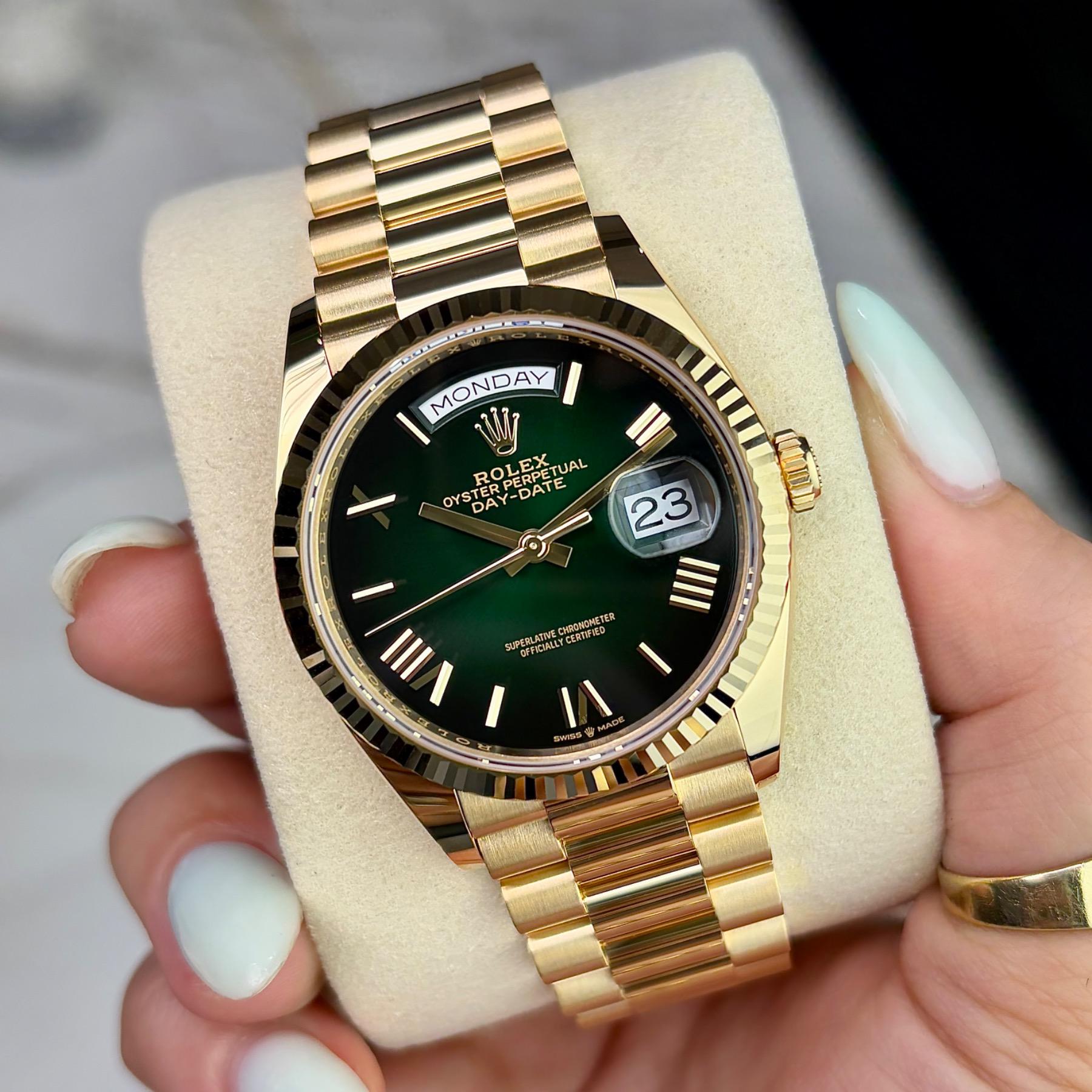 Timestamp: https://imgur.com/a/CLfwlzu Album: https://imgur.com/a/5mcjcoV ________________________________________________________________________________________ The Rolex Day-Date 36 128238 is a bold and luxurious expression of the President collection, crafted in solid 18k yellow gold and highlighted by its striking green ombré dial that transitions beautifully from bright center to darker edges. The iconic fluted bezel and President bracelet complete the unmistakable Day-Date aesthetic, wh...