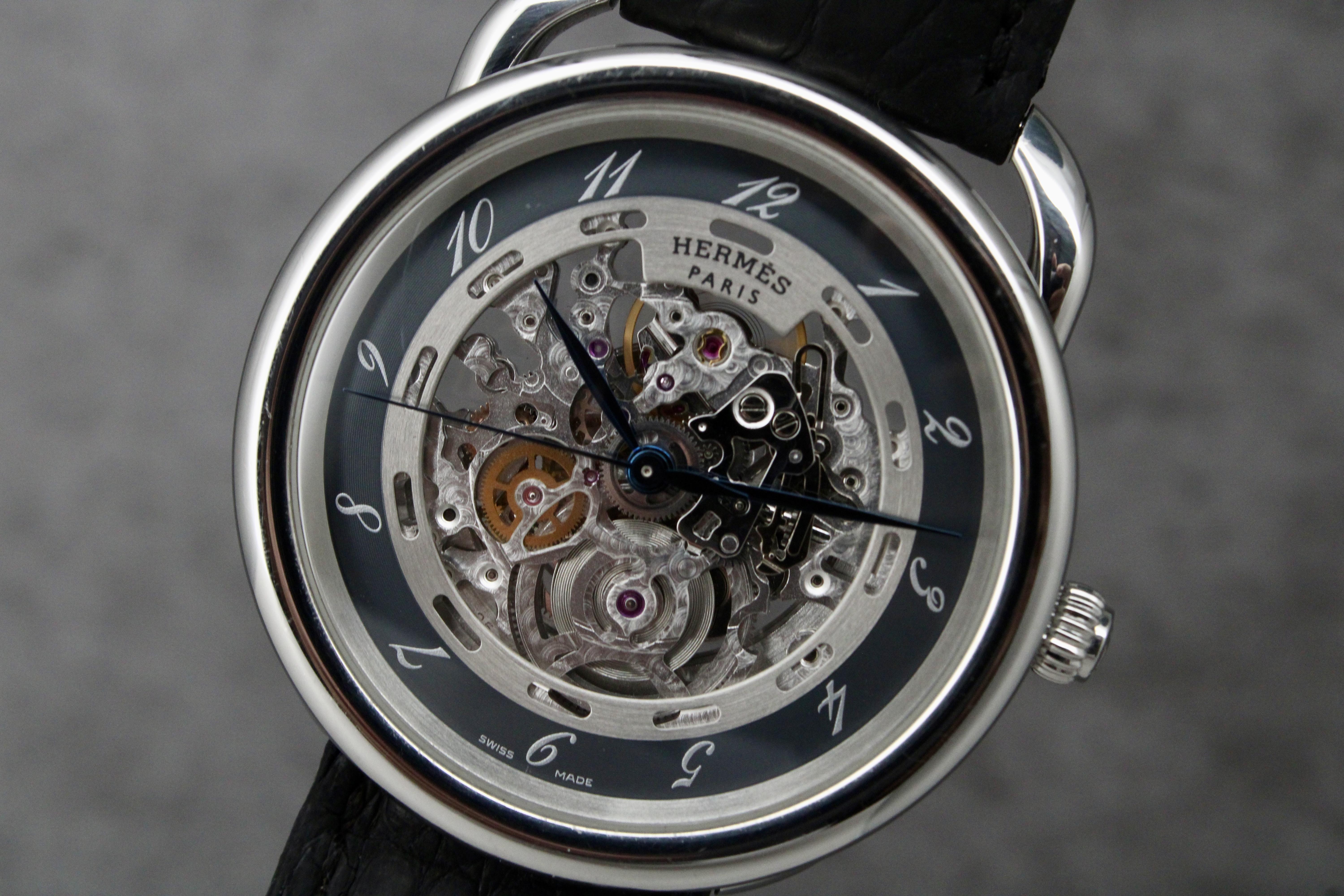 Timestamp: [https://imgur.com/a/7kQG1O3](https://imgur.com/a/7kQG1O3) Offered for sale is a Hermès Arceau Squelette (ref. AR6.710), a distinctive skeletonized timepiece from Hermès featuring the signature asymmetrical lugs of the Arceau collection. The open-worked dial highlights the mechanical movement while maintaining the refined design language Hermès is known for. This example comes as a complete full set and is in good overall condition, showing normal signs of wear consistent with regu...
