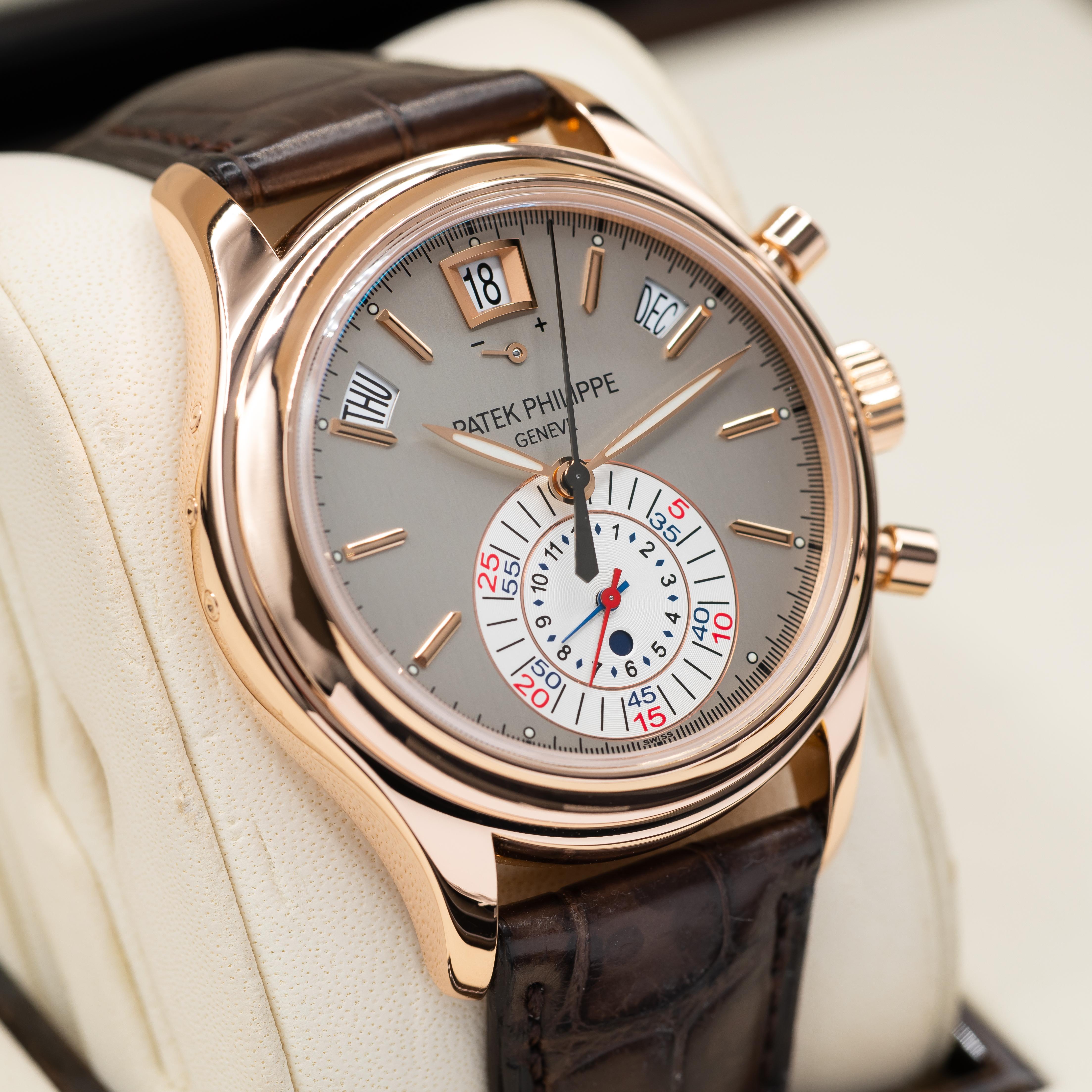 Up for sale here is an excellent example of the Patek Phillipe Annual Calendar, cased in 40mm of rose gold and sporting the brushed nickel grey dial. Ref. 5960R-001. The 5960 is powered by the automatic caliber 28-520 movement, with a day/night indicator, annual calendar, and power reserve complications. All highly legible against the grey dial. What’s really nice about this movement is the vertical clutch on the chronograph- it can be used as a running seconds hand! Really, it can. Comes as ...