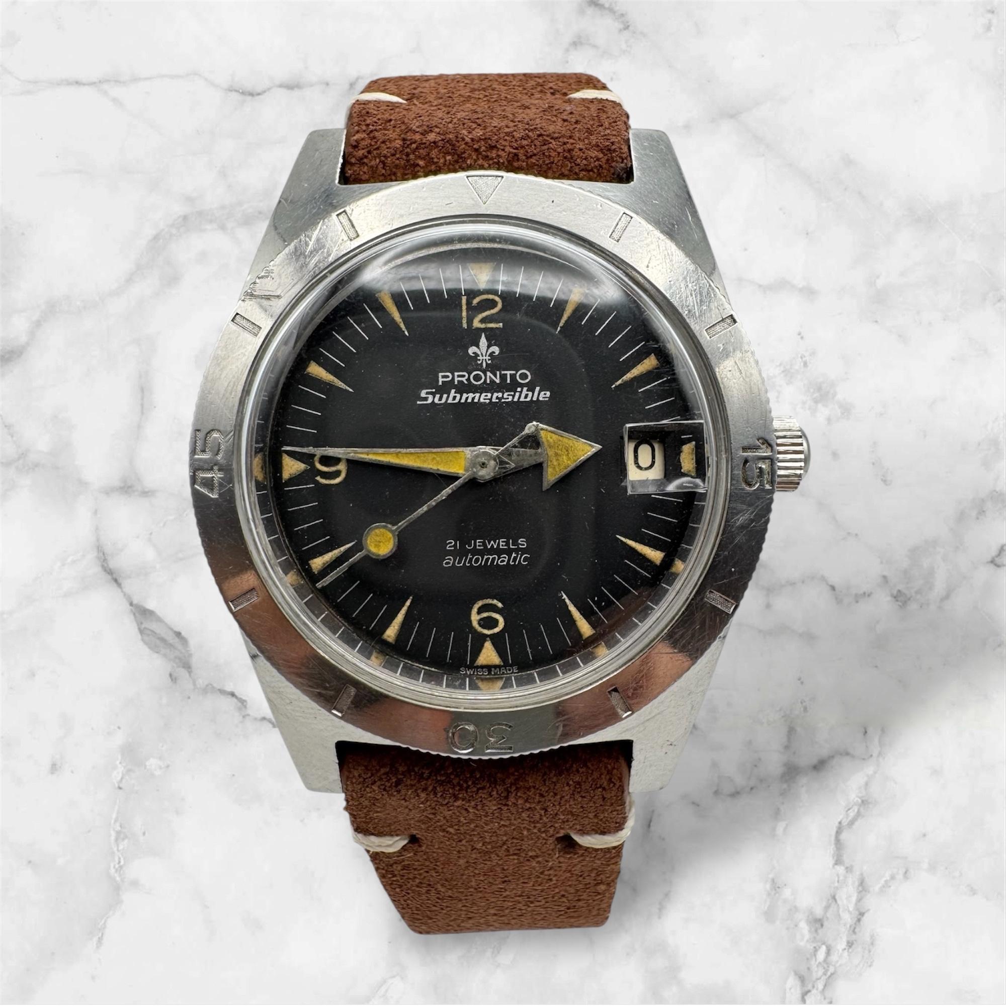 Vintage 1960’s Pronto Submersible Steel in Original Condition This 1960’s Pronto Submersible presents a wonderful example of a well-preserved vintage dive watch. The stainless steel case appears unpolished, showcasing honest wear with visible scratches and light marks that add character and authenticity. Its original black tritium dial has developed a beautiful warm yellow patina on the indices, perfectly complemented by the matching broad arrow hands. While the movement’s service history is u...