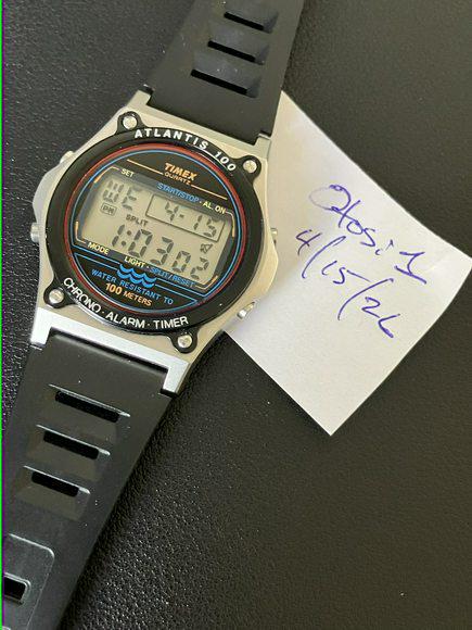 Selling a very nice Atlantis 100. This was sold to me as NOS. Don't know about that but it's nice. One tiny flaw in the bezel at the top left, visible in pics. Looks like a manufacturing defect to me. See pics: [https://imgur.com/a/atlantis-100-fj3FzeS](https://imgur.com/a/atlantis-100-fj3FzeS) Great feature set: Time Day/date Alarm Timer Chrono Dual time Nice new comfy band I found that works well. $95 shipped in CONUS. PayPal. Please comment and send a chat.
