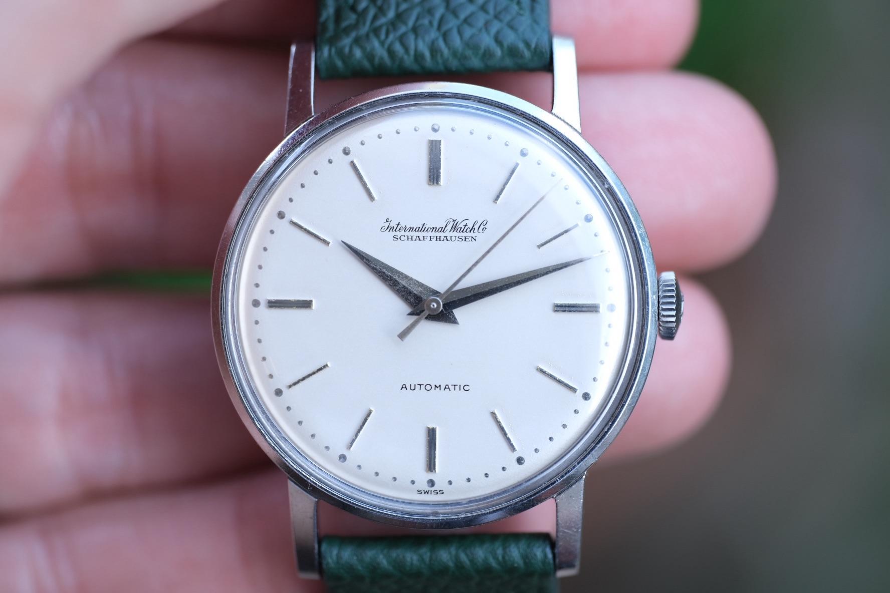 Looking for a vintage dress watch? Maybe something classic that also manages to stand out from the crowd? Ya gotta look at what IWC was doing mid century. Often seen in gold, and often with a hand wound movement, really fantastic to see this oversized, early 1960s Calatrava in stainless with automatic movement. On a gorgeous new handmade green leather strap, this one could very easily be a daily. FULL PICS: https://imgur.com/a/ZkGFToy DIAL: Silver sunburst dial with my absolute favorite featur...