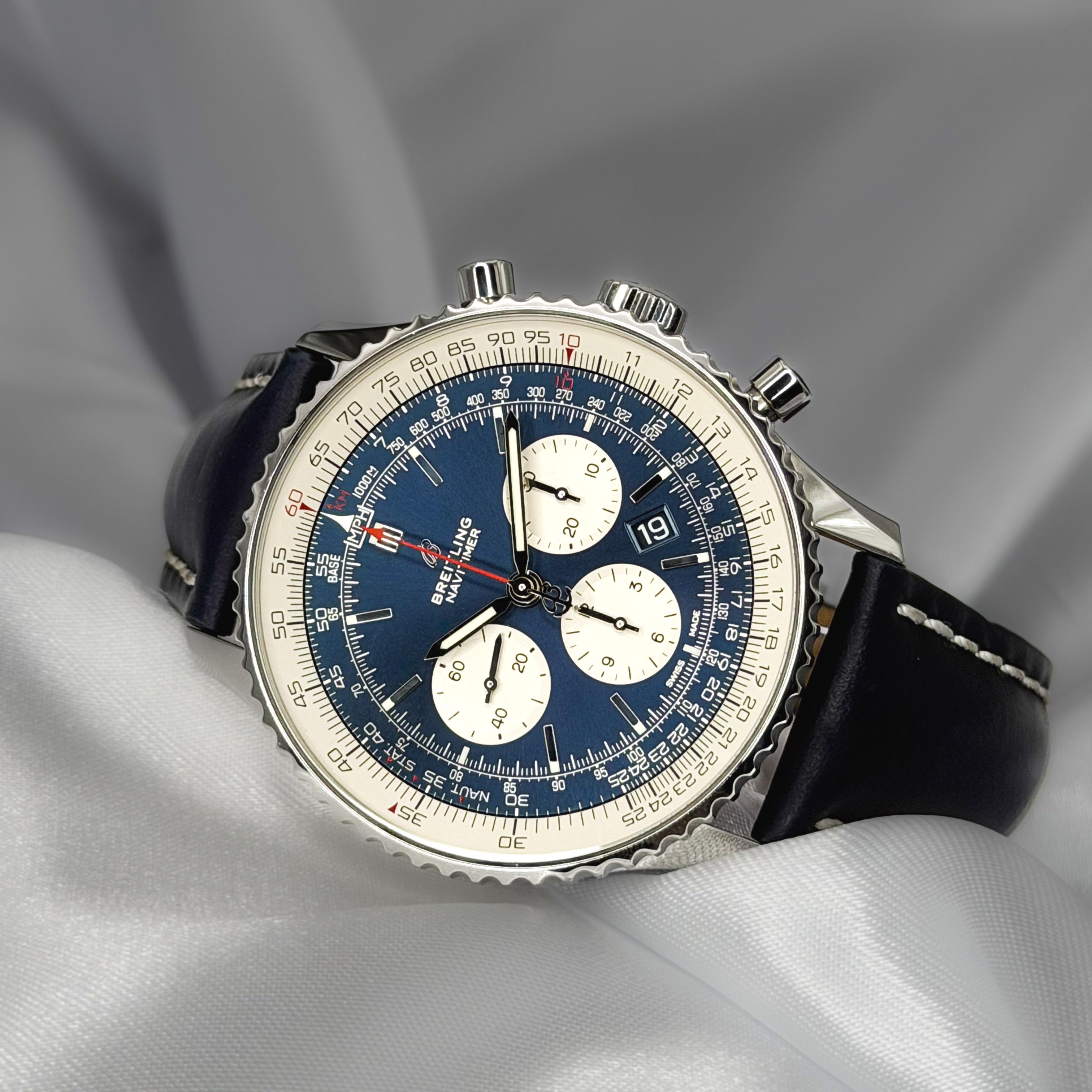 The Navitimer is one of those watches with a story behind it that actually matters. Born in 1952 for the Aircraft Owners and Pilots Association, the slide rule bezel wasn't just a design choice — pilots were genuinely using it to calculate fuel consumption and airspeed from the wrist. That history is baked into every version they've made since, and you feel it when you put this one on. The 46mm case is a statement but it earns it. The blue dial comes alive in different light — deep navy one min...