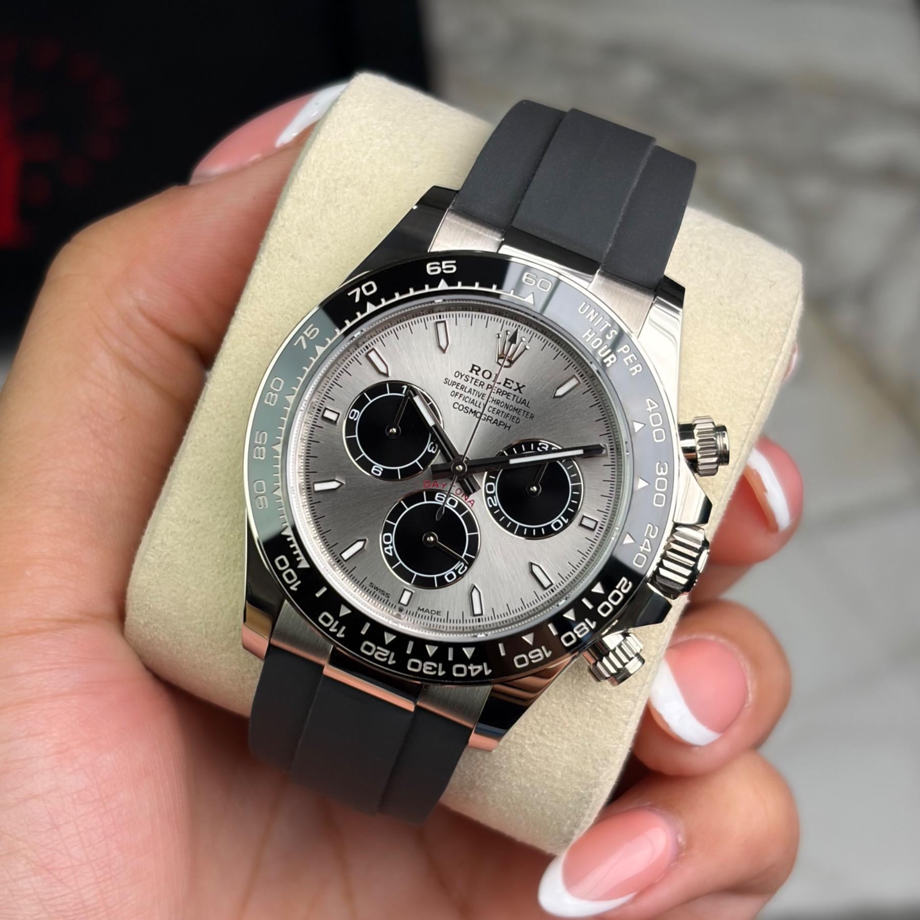 Timestamp: https://imgur.com/a/ndzlRQH Album: https://imgur.com/a/8ad5qsl ________________________________________________________________________________________ The Rolex Cosmograph Daytona 126519LN delivers a sleek and modern take on the iconic Daytona, featuring a striking steel-and-black “Ghost” dial paired with a black Cerachrom bezel. Crafted in 18k white gold and fitted on the Oysterflex bracelet (D/F straps), it balances luxury with a sporty, contemporary edge. Powered by Rolex’s in-h...
