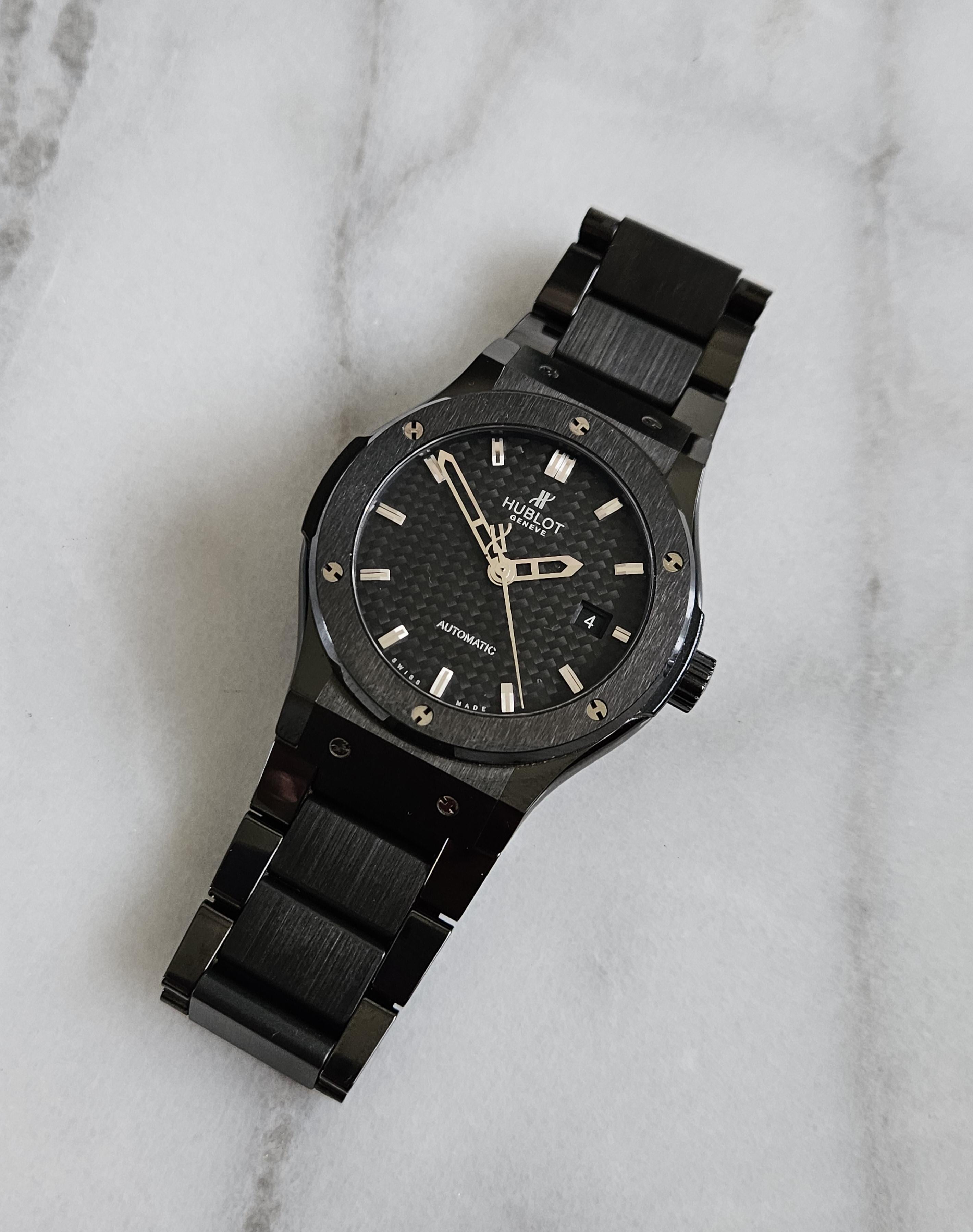 **Hublot Classic Fusion “Black Magic” - Full Ceramic** Stealthy, all-black take on Hublot’s modern minimalist design that perfectly captures Hublot’s “Art of Fusion” philosophy. What makes this reference especially cool is the full black ceramic execution: case *and* bracelet, giving it that lightweight, scratch-resistant, high-tech feel that Hublot does well. The woven carbon fiber dial adds depth and texture that shifts subtly in the light. At 42mm with a slim profile, it wears comfortably an...