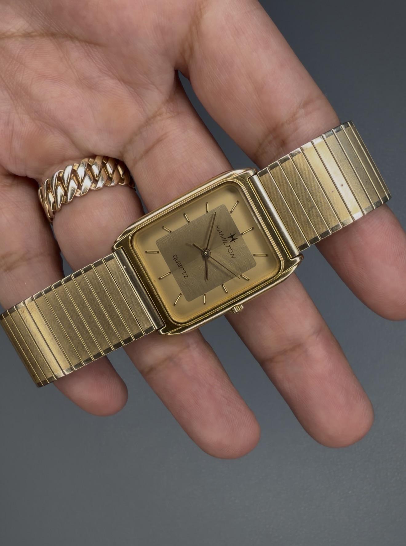Vintage Men’s Hamilton Tank ref. 8262 Details: A beautiful vintage Men’s Hamilton Tank in gold tone, with an elastic bracelet. Has simple time functions, watch only, and in great condition - see the photos for yourself! Makes a great gift, or for any many looking for an elegant and unique Tánk style watch to add to their collection! -$247 shipped firm -Includes shipping (US). I accept Venmo, Zelle, CashApp, and PayPal (+4% if using G&S) -Case size: 23x33mm -Movement: Quartz -Timestamp: htt...