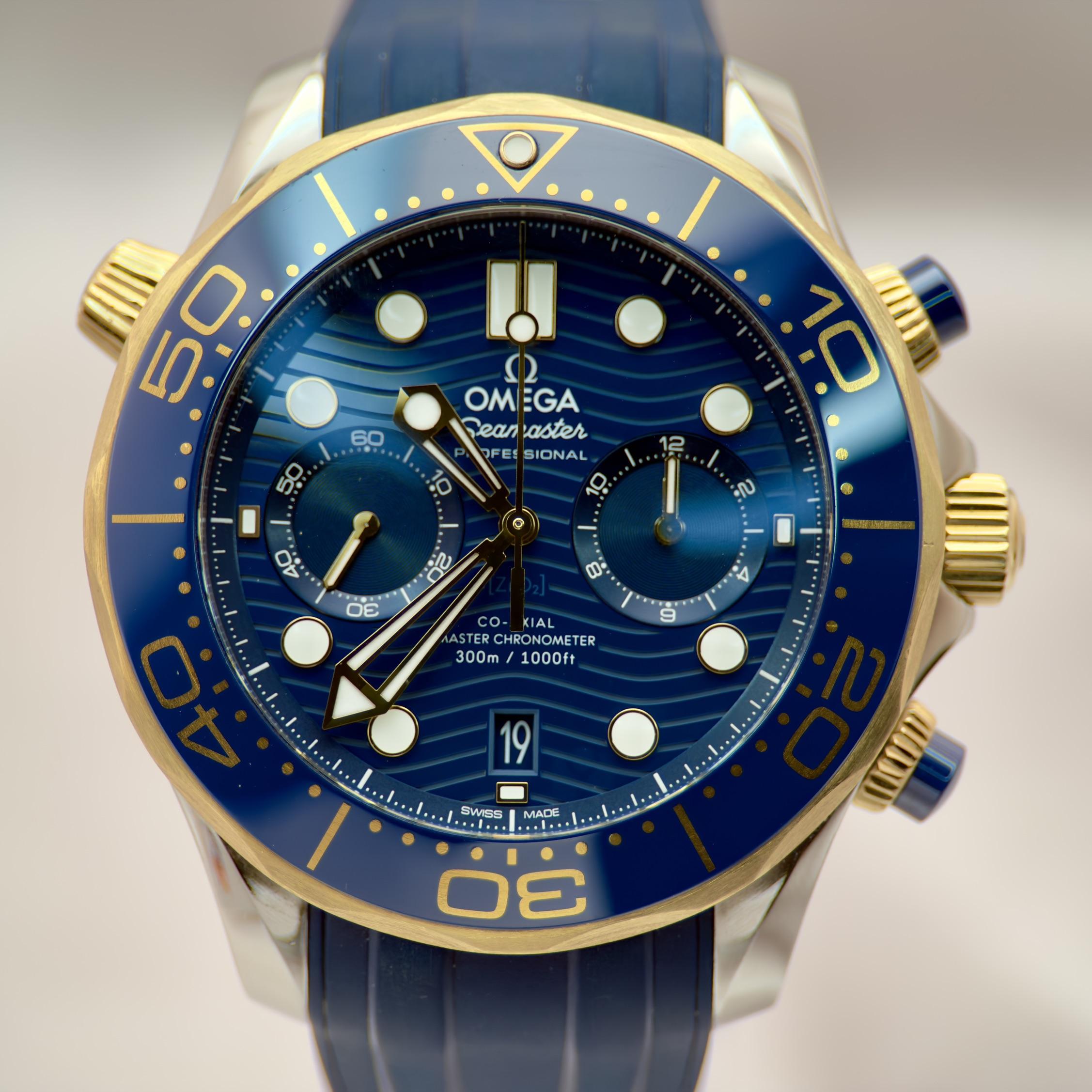 Omega Seamaster Diver 300M Chronograph 44mm Ref. 210.22.44.51.03.001 | Full Set | Mint Condition $9250 + ship Offered here is the striking Omega Seamaster Diver 300M Chronograph in stainless steel and 18K yellow gold — a bold sport-luxury piece with strong wrist presence and everyday versatility. Key Highlights: • 44mm steel case with 18K yellow gold accents • Blue ceramic bezel with Ceragold™ diving scale • Signature blue wave-pattern dial with gold hands and indices • Co-Axial Master Ch...