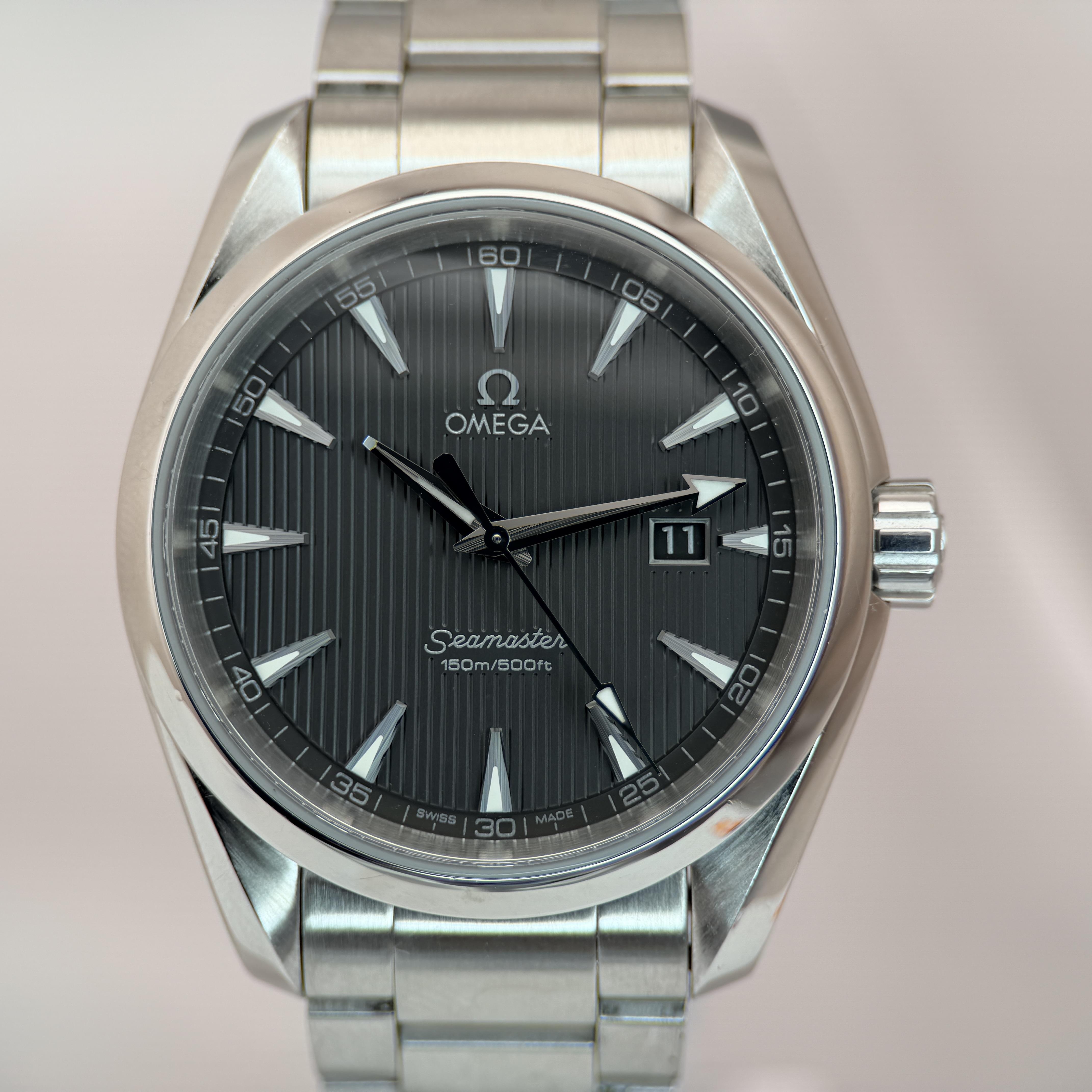 Omega Seamaster Aqua Terra 150M 38mm Grey Teak Dial | Quartz | Discontinued | Full Set (Travel Case) Price : 2590 Offered here is the elegant and increasingly hard-to-find Omega Seamaster Aqua Terra 38mm featuring the desirable grey teak-concept dial—a subtle, vertically textured finish inspired by yacht decking that gives the watch depth and versatility in any lighting. This reference is now discontinued, making clean examples like this especially attractive to collectors looking for a refin...