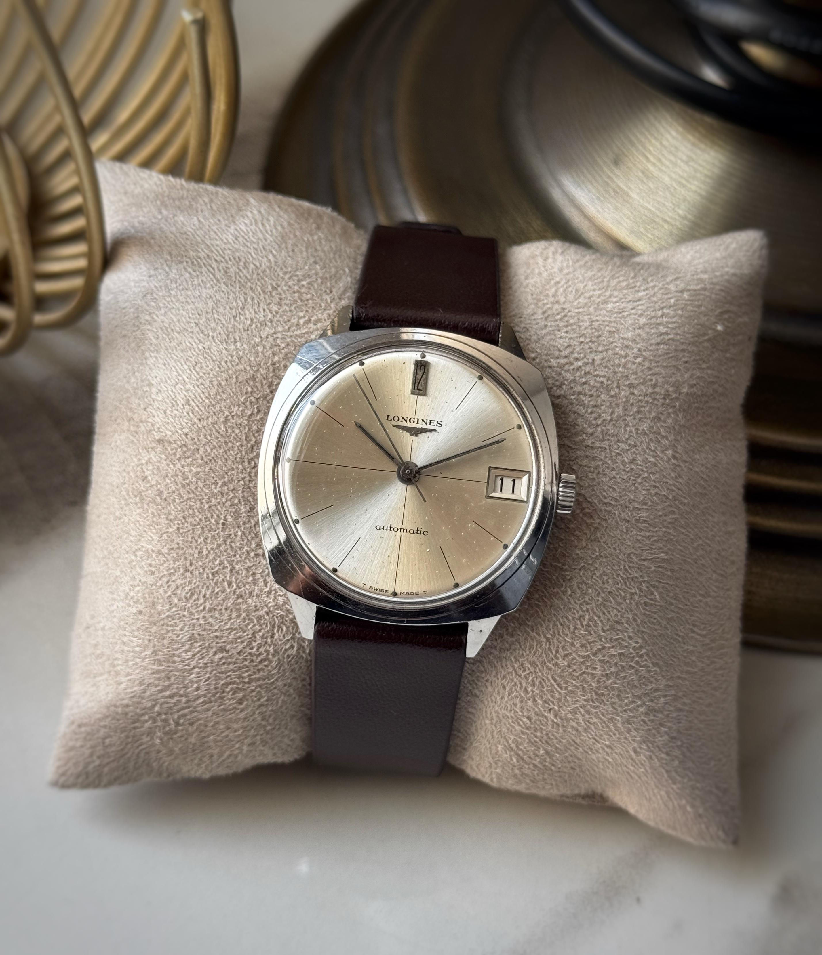 [WTS] Longines Automatic Cushion Case 7678 - Crosshair Dial only for 425$ π’ Up for sale is a longines cushion case reference 7678 featuring a stainless steel case with a case size of 35mm. Condition of the case is good no major dents or dings just a few hairline scratches overall. Dial shows signs of aging with a creamy sunburst and a crosshair. Original crystal and longines signed crown. Comes on an aftermarket brown leather strap with a standard buckle. Automatic movement calibre 345 worki...