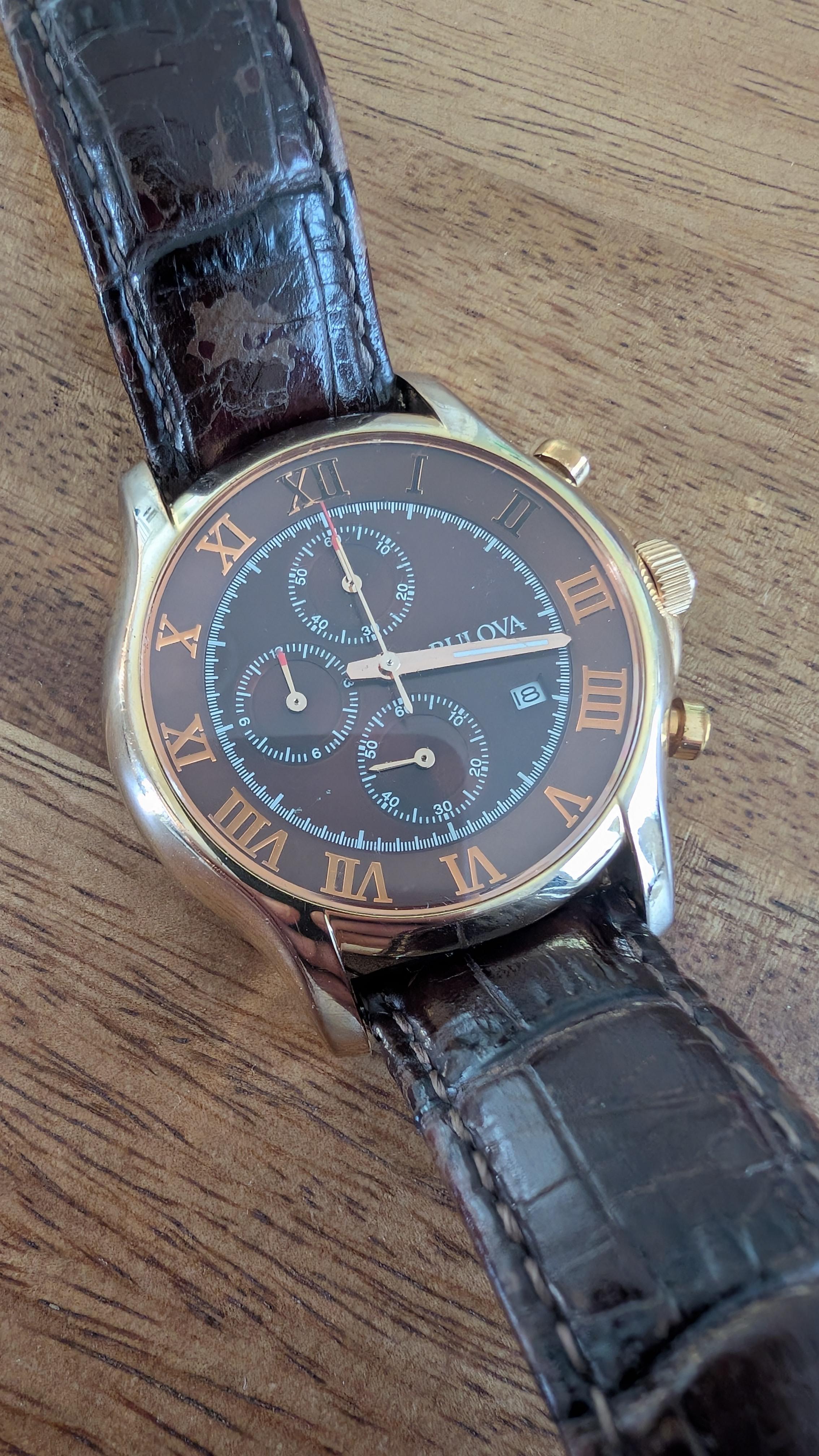 Selling a Bulova 97B120 chronograph watch in beautiful rose gold and chocolate tone colorway. Watch is running and keeping good time, all functions work. Leather strap is worn and could use replacing (21mm lug to 20mm taper) Watch has normal signs of use and a small scratch on the crystal near 1 o'clock (pictured). Asking a flexible $99 shipped. A recent used condition with box sale on eBay was for $180. Please reach out with any questions! Here is a link to some info on the watch: https:/...