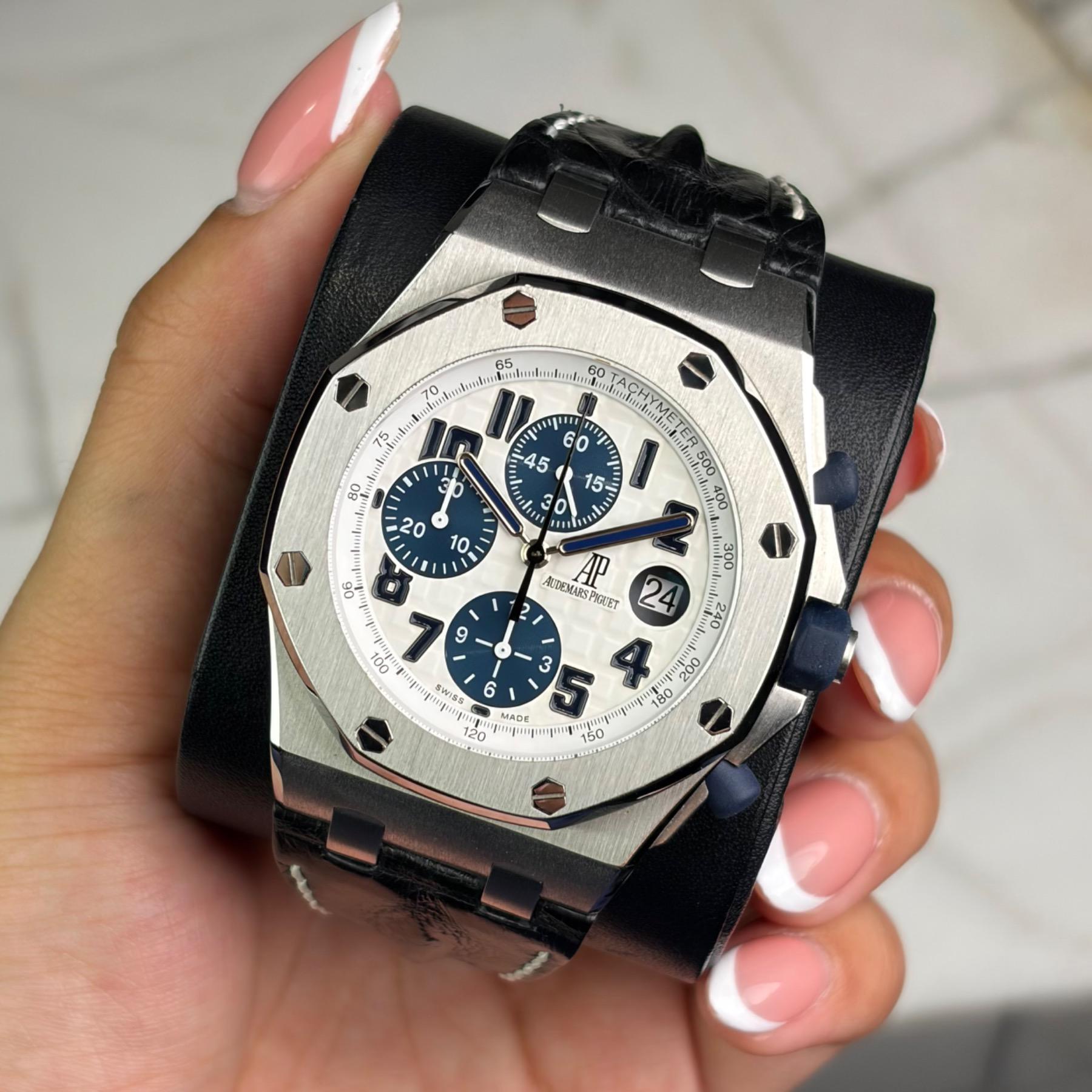 Timestamp: https://imgur.com/a/h1y5eR8 Album: https://imgur.com/a/fpn1mWc ________________________________________________________________________________________ The Audemars Piguet Royal Oak Chronograph 42mm 26170ST (2013) is a bold and iconic take on the Royal Oak, featuring a crisp white “Grande Tapisserie” dial accented by striking blue chronograph subdials for strong contrast and visual depth. Its 42mm stainless steel case with the signature octagonal bezel delivers unmistakable wrist pr...