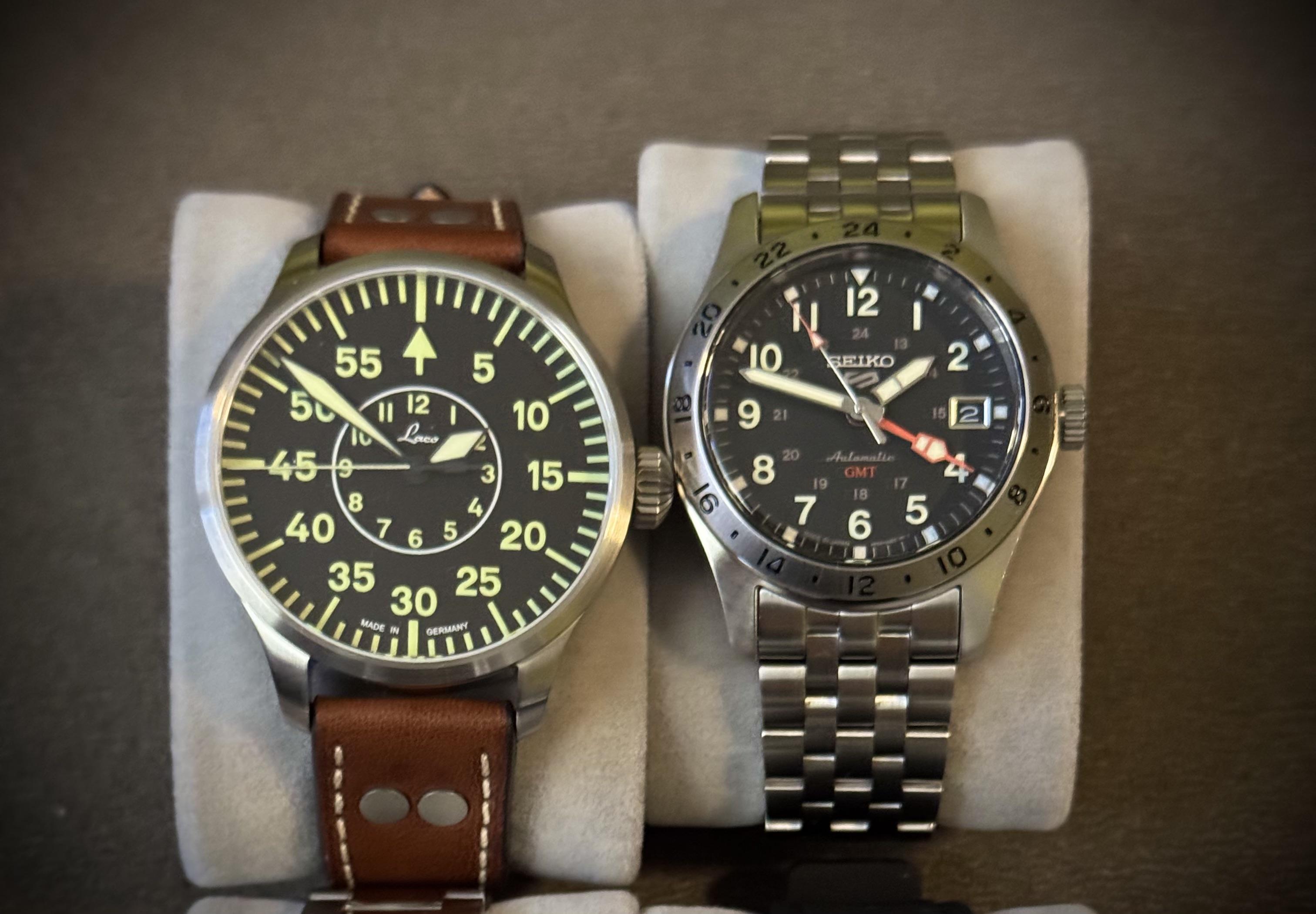 [WTS] they are technically brand new wore them once mint condition. Extra links are in the box. 2️⃣2️⃣0️⃣ Seiko 5 Sport GMT 39.4mm automatic 3️⃣0️⃣0️⃣ Laco Pilot Watch Aachen 42mm Automatic US ONLY, no trades.