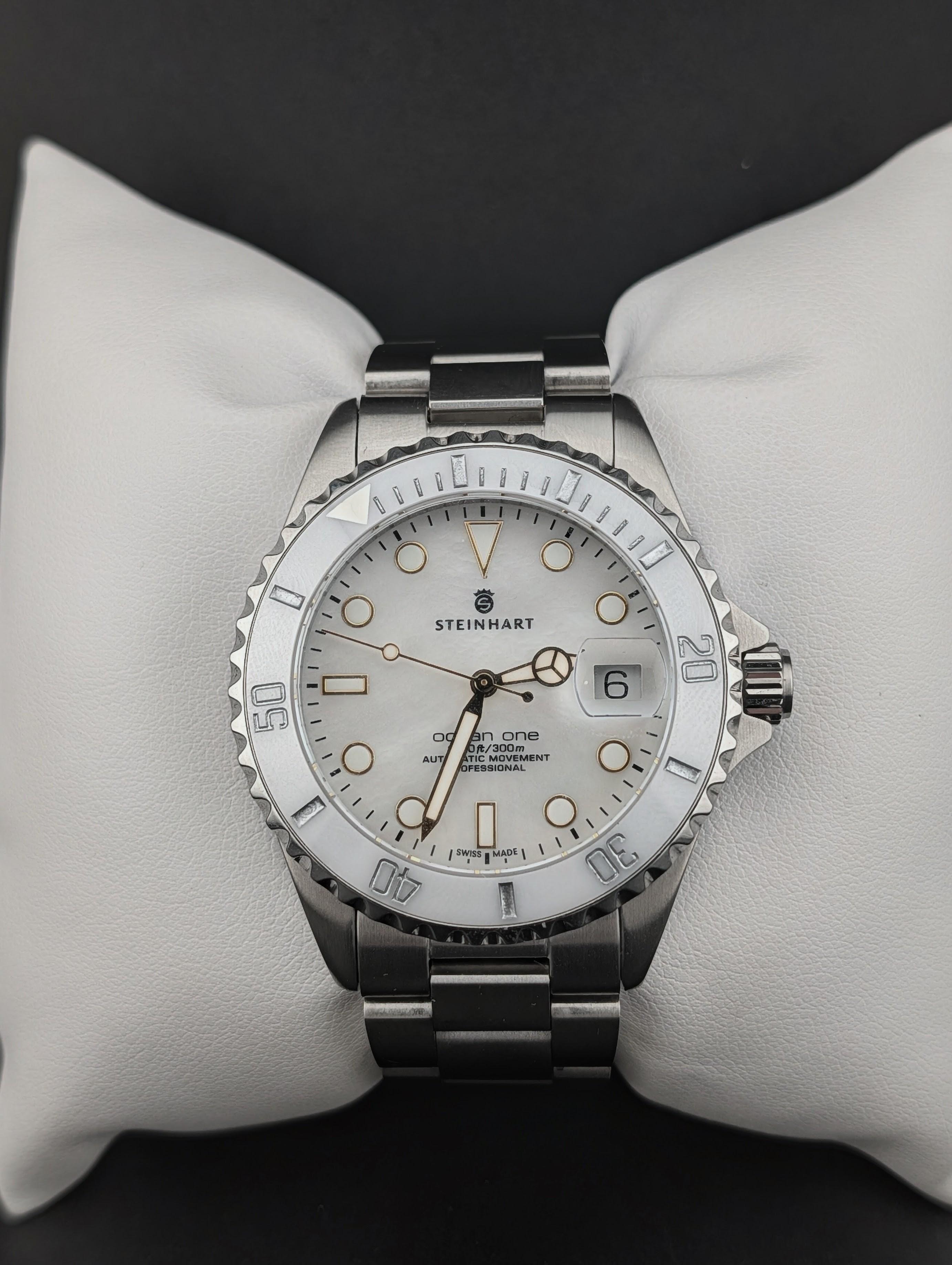 Up for sale is a stunning Steinhart Ocean One 39 featuring the iridescent White Mother of Pearl (MOP) dial and a matching white ceramic bezel. This model is a perfect blend of a robust tool watch and an elegant timepiece, offering a unique shimmer that changes with the light.Item Details Condition: Excellent/Near-Mint (Dec 2025 Warranty Card). Case Size: 39mm diameter, 13mm thick, 47mm lug-to-lug. Movement: Swiss-made SW200 Elaboré automatic, 26 jewels. Dial: Genuine white Mother of Pearl with...