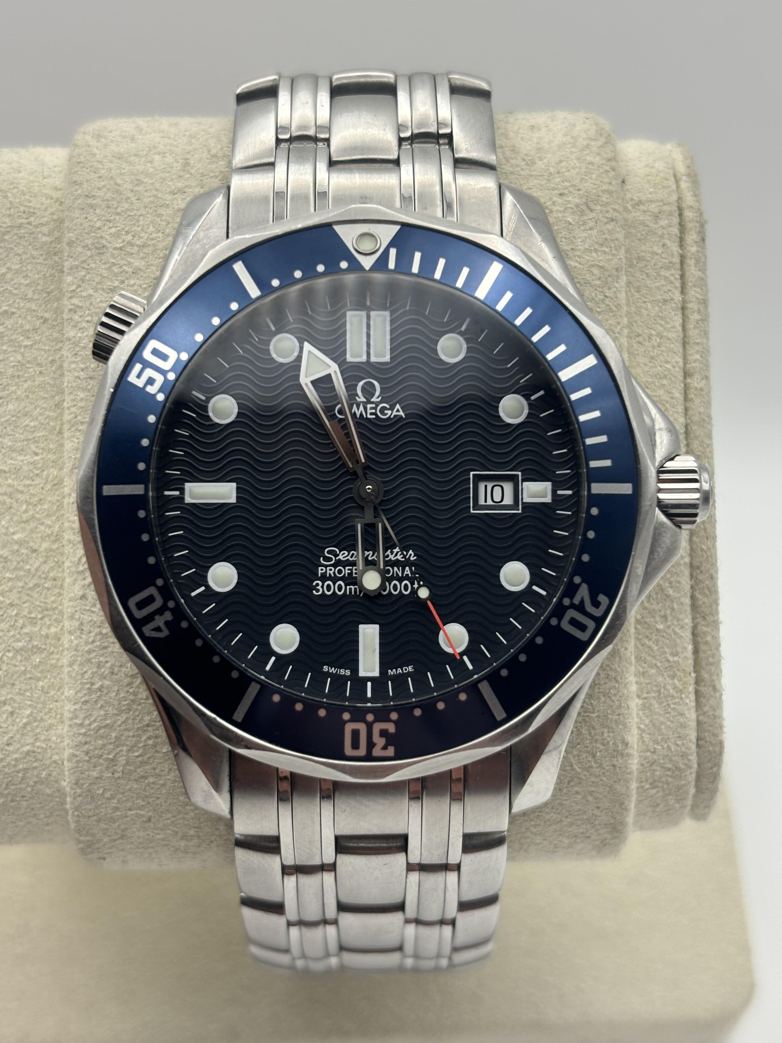 Up for sale is a classic Omega Seamaster Professional 300M quartz (Ref. 2541.80.00) in the iconic blue wave dial configuration. This is the Bond-era style piece that never goes out of style. Details: • Reference: 2541.80.00 • Quartz movement (low maintenance, grab-and-go) • 41mm case • Blue wave dial with date at 3 • Blue aluminum bezel insert • Original Omega stainless steel bracelet • Helium escape valve Condition: Pre-owned condition. Watch is running properly and keeping accurate ti...