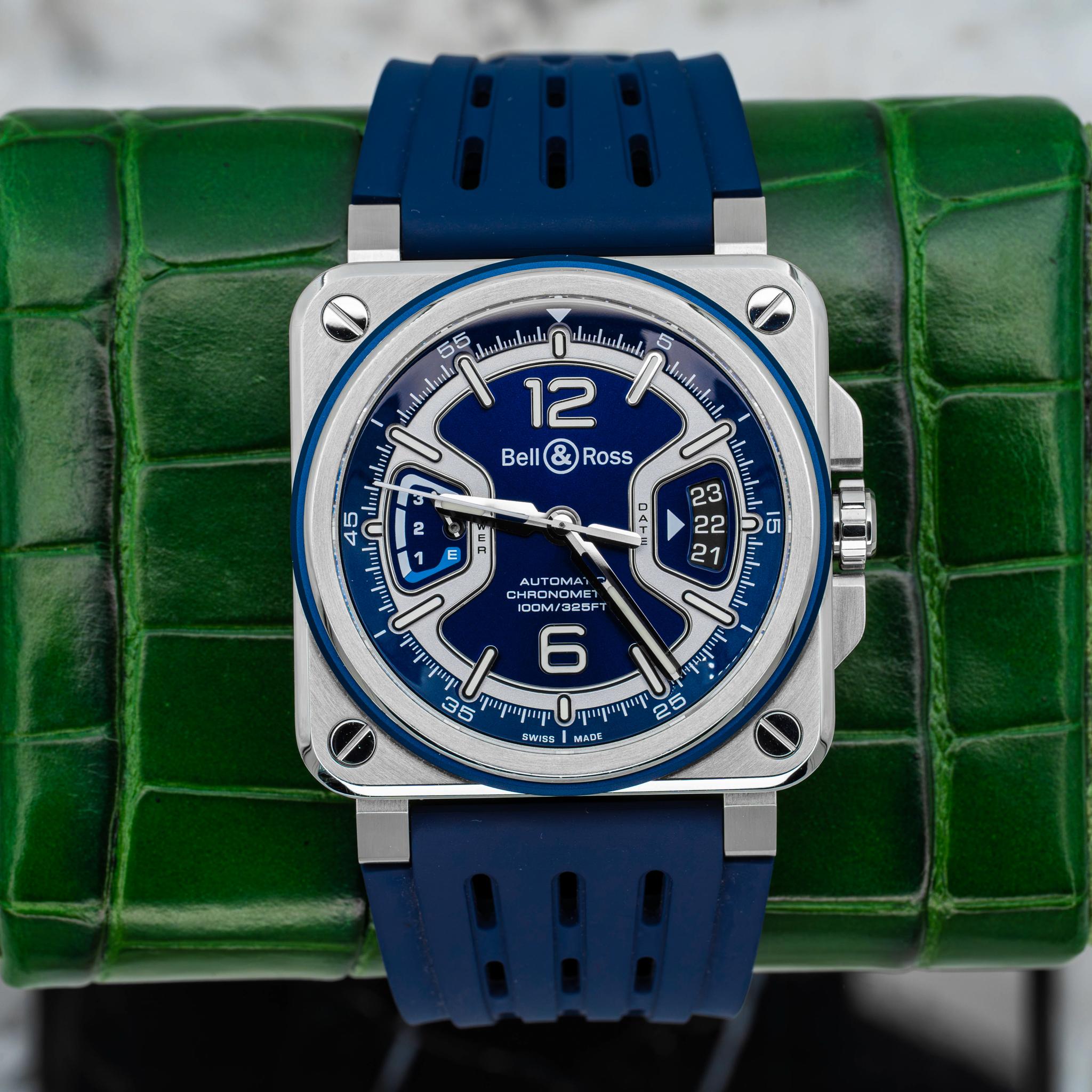 2025 Bell and Ross BR-X3 Steel w Power Reserve and Date Blue Dial on Strap B+P Price: 5,200 The Bell & Ross BRX3R-BLU-ST/SRB has a captivating bright blue dial with a power reserve and date complication making it a beautiful sight to behold. It’s classic square B&R 41mm case with a comfortable matching blue strap make it a traditional B&R in that sense, but it’s upgraded in house movement with a 5 year B&R warranty make it something special and a must have for B&R collectors. This wat...