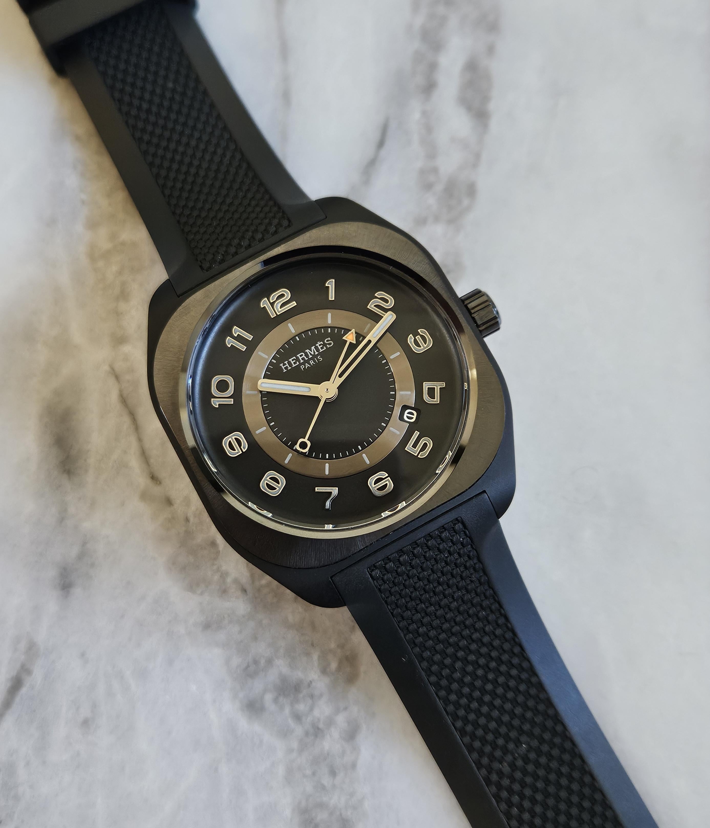 **Hermes H08 - Graphene Edition** Slim and sporty, the H08 Graphene edition features ultra-light graphene-filled composite case and an all-black design. What is **graphene**? It is material made of pure carbon atoms that has superior strength. This exotic material is relatively new in the watch world and can be found on very few manufacturers, such as Richard Mille. 39mm graphene case, ceramic bezel, on black rubber strap. Manufacture Hermès H1837 automatic movement. Excellent condition, some...