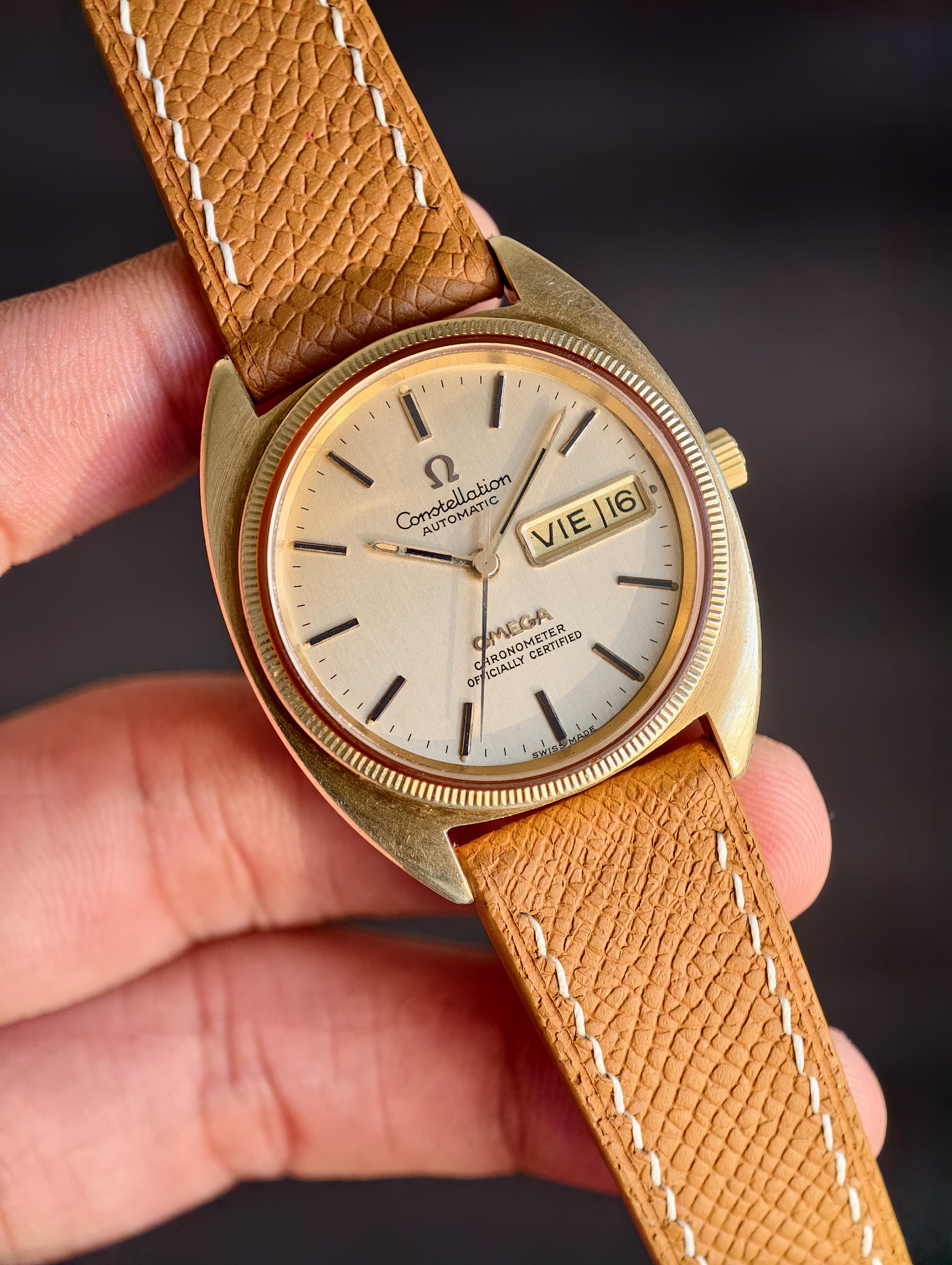Up for sale is an **Omega Constellation ref. 168.0057** featuring a clean flat dial with applied indices and day-date complication. The dial has a warm, even tone that pairs nicely with the gold elements, giving it a classic and understated vintage Constellation look on wrist. The case construction includes a solid 14K gold bezel with 14K gold capped case and stainless steel caseback, finished with the original observatory medallion in 14K gold. Case measures 35mm x 40mm x 10mm with 19mm lug wi...