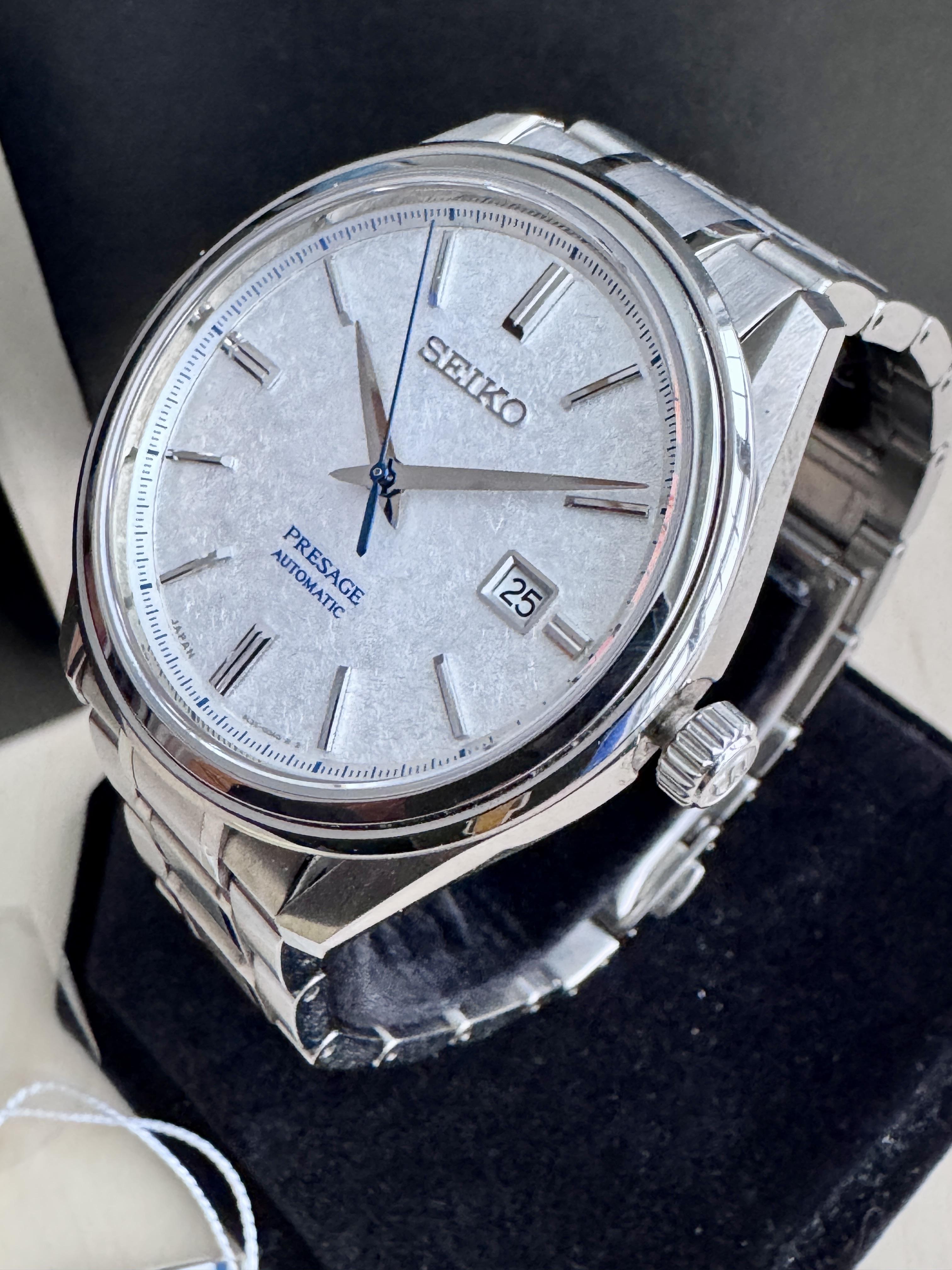Hey [r/watchexchange](https://www.reddit.com/r/watchexchange/), up for sale is a bit of a rare bird, the Presage SJE073 with the “Frost Dial”. This is a limited edition Presage with a front loaded 6L35 movement. Other than the unique movement another interesting thing to note is that this watch has Ziratsu polishing normally only seen on Grand Seikos. The watch functions as it should and no real damage to note. The high polish bracelet link inlays show light wear and there is a flea bite on the ...