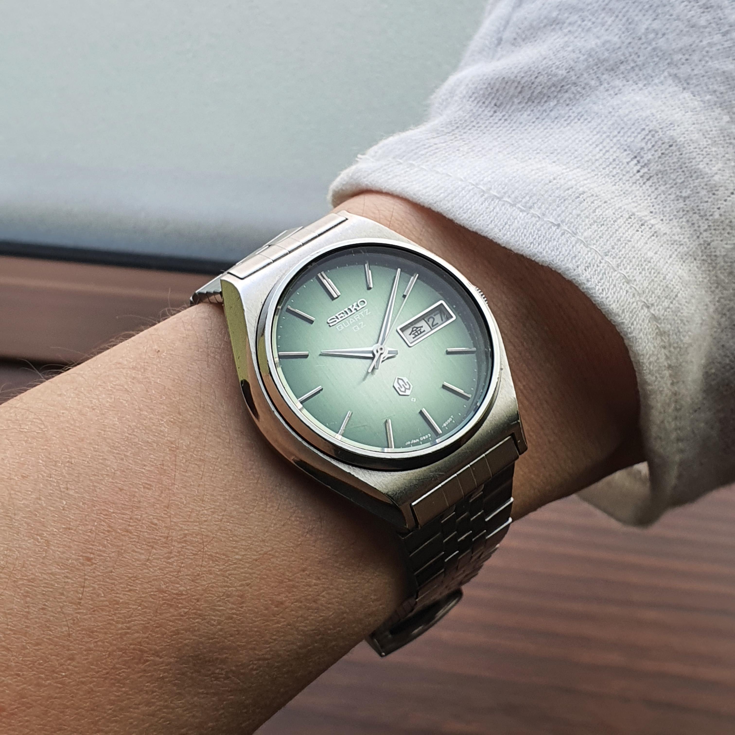 [WTS] Seiko Aug. 1975 "09QZ" Rare Green Kiwi Fumé Dial, Triple Day Font, Original Bracelet w/ Solid Links (0923-8060) Very Early Quartz $205 (message me if you can't see the details/description in the comments)