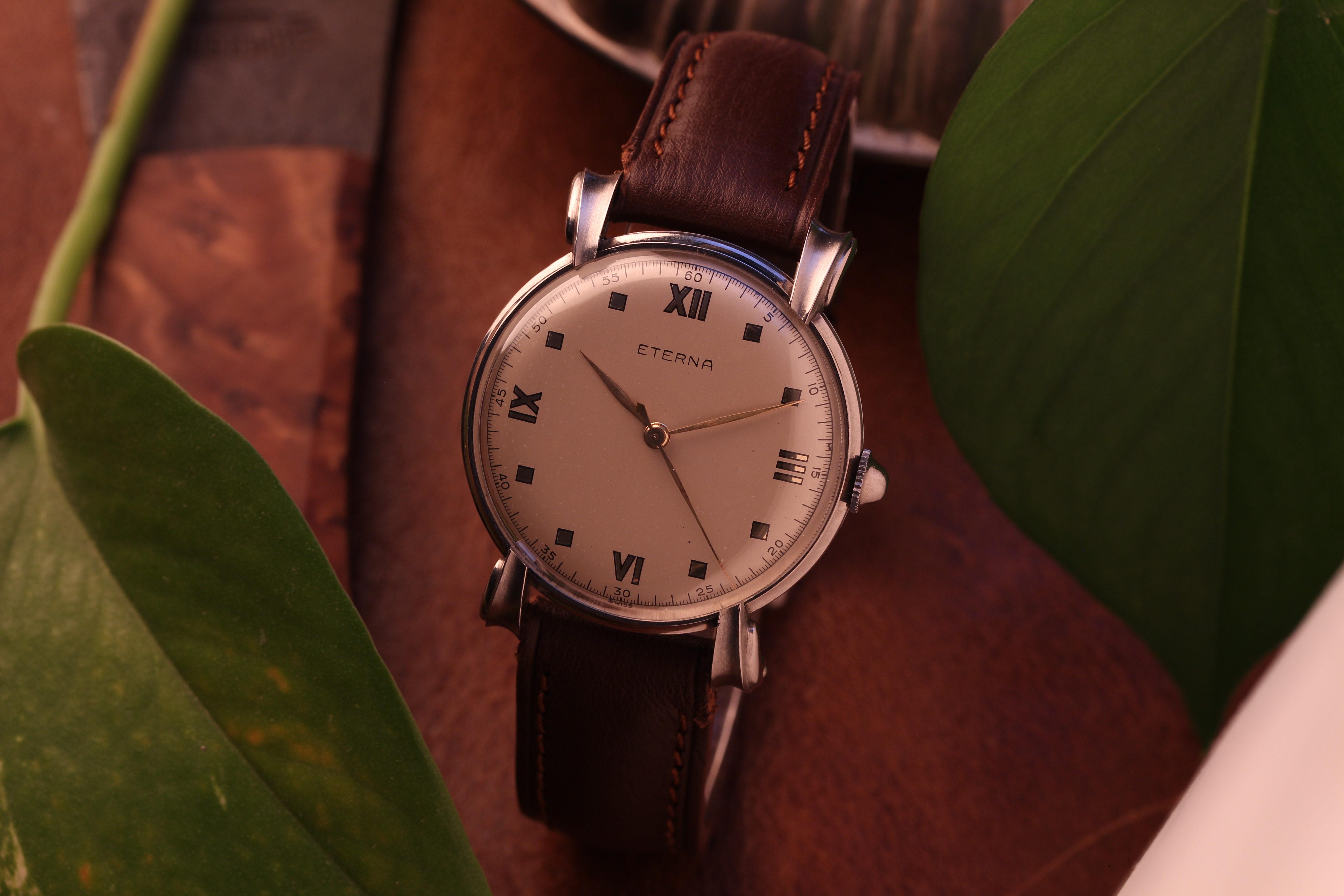 🍸 \[Now Offered\]: A 1950s Eterna in stainless steel — quietly distinctive, and all the better for it. The sculpted lugs give the watch its shape, while the mirrored indices catch the light beautifully and bring a surprising amount of life to the dial. Paired with its restrained proportions, it’s the sort of thoughtful mid-century design that only grows more compelling the longer you spend with it. A simple, crisp example with plenty of charm. Running well. Case Size: 34mm Lug Width: 16mm...