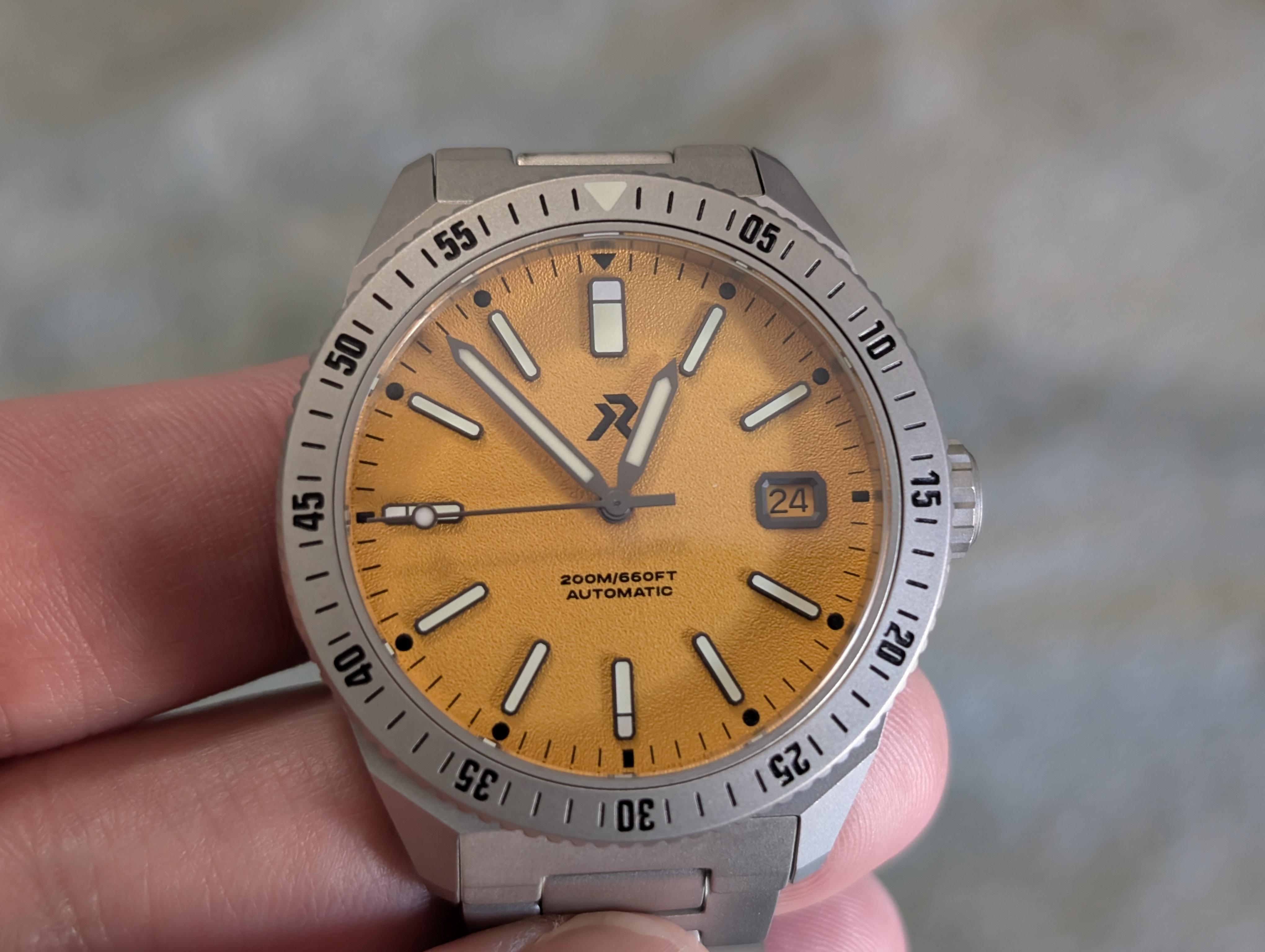 Album: [https://imgur.com/a/rze-endeavour-titanium-4v9QRdG](https://imgur.com/a/rze-endeavour-titanium-4v9QRdG) Timestamp: [https://imgur.com/isjOuYW](https://imgur.com/isjOuYW) For sale is my RZE Endeavour in medallion yellow. Watch, bracelet, and clasp are all fully titanium. Very lightweight and wears amazing. Condition is excellent. The watch head and crystal have no scuffs or marks. The underside of the bracelet has some marks where it rubs against the clasp when closed. Full specs a...