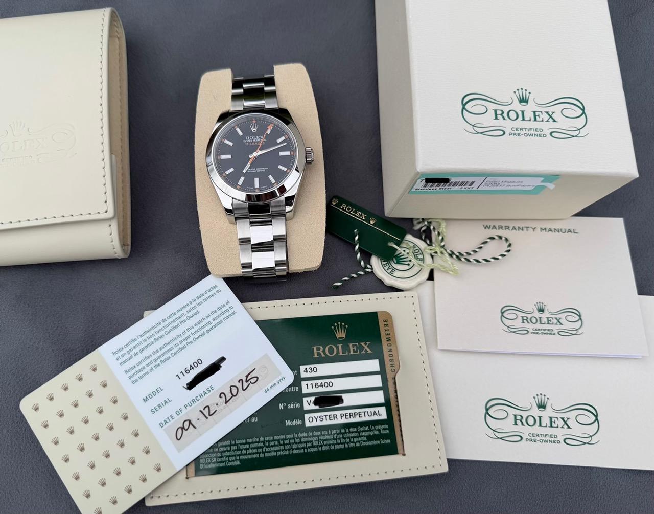 This is a fantastic example of the classic black dialed Milguass that was just purchased as a CPO from Rolex in 12/2025 (originally sold in 2010). So, you know you're getting a vetted watch that has been serviced and has quite a bit of remaining warranty left. Overall it is in near mint condition - a few small marks of the polished surfaces that you can see when ho0lding in the right light. Keeping time within spec. Comes with CPO box, sleeve, books, tags, original warranty card (2010)...