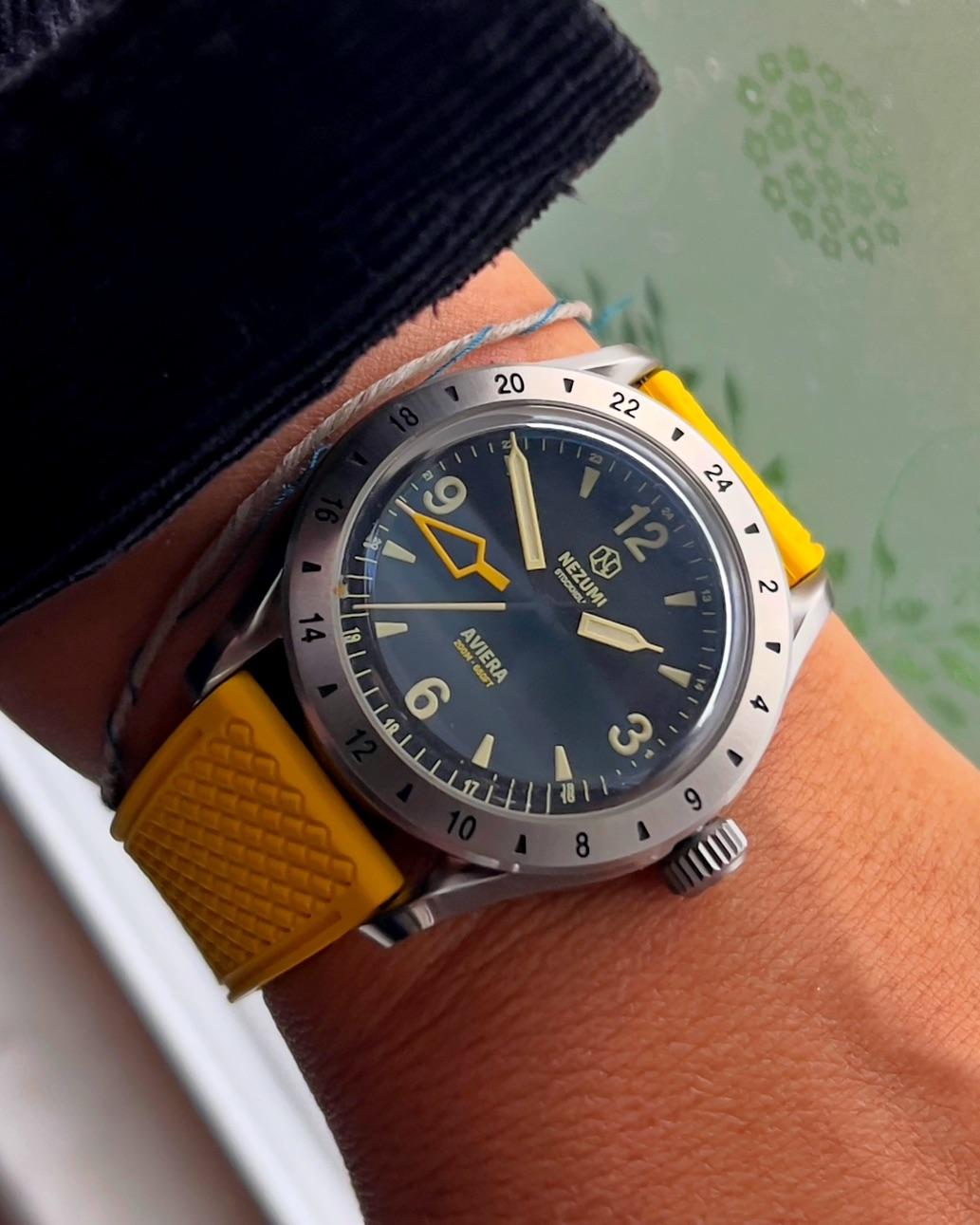 The Nezumi Aviera GMT Ref. AA3.102 from 2025 a third-generation mechanical tool watch from the Swedish brand Nezumi Studios. As the core production model in the updated Aviera lineup, it is a "true" or "flyer" GMT, meaning the local hour hand can be adjusted independently for travel. Used but good condition _________________________________________________ Timestamp pix: https://imgur.com/a/kggF7Pk Specifications: 40mm diameter, 47mm lug-to-lug, 13.3mm thickness Movement: Miyot...