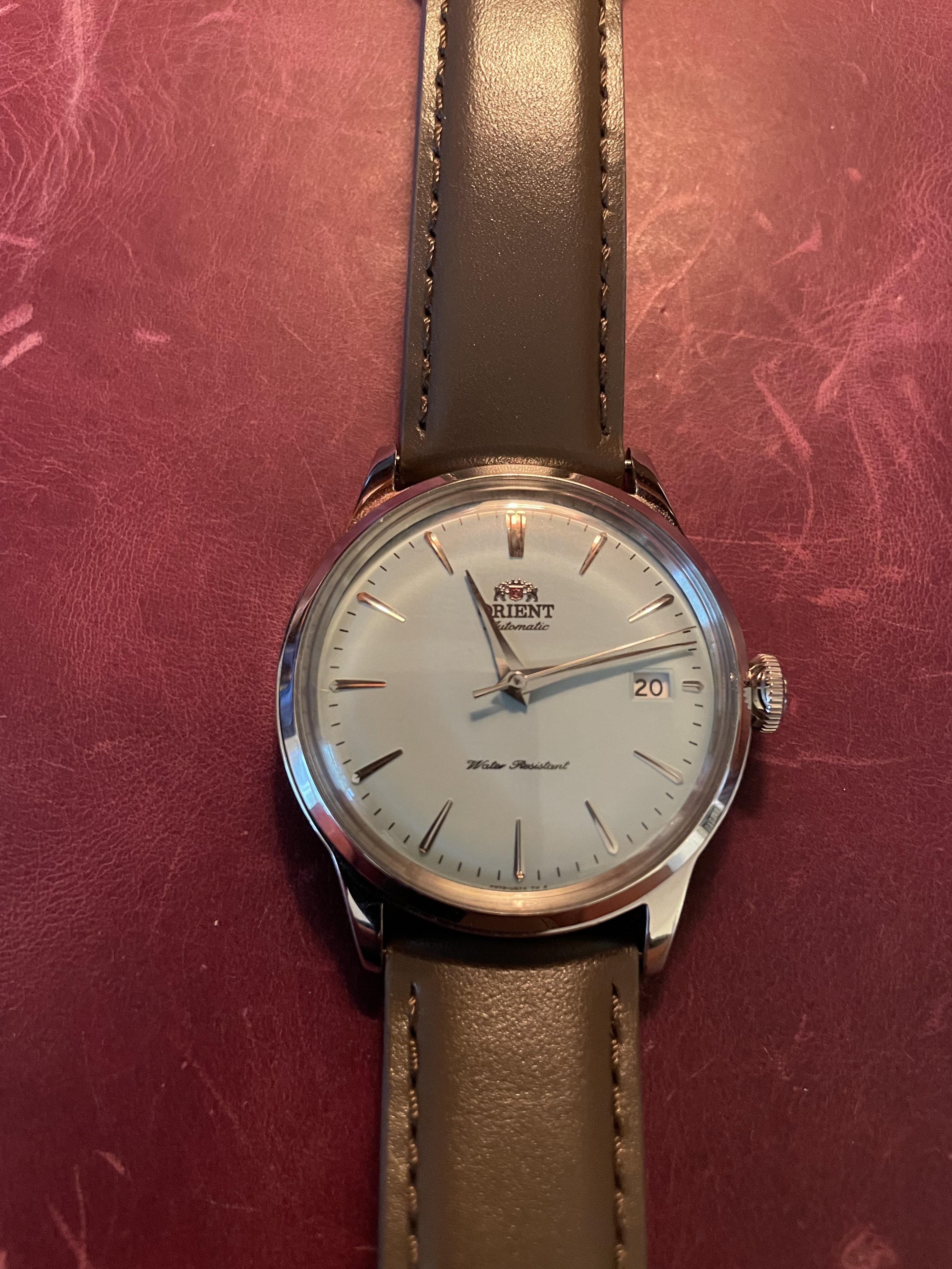 Limited edition (it says so on the back!) baby blue Orient Bambino. Bought just about a year ago, worn maybe a dozen times. Lovely, fantastic watch, truly a great value in a wonderful color. I just don’t wear it as much as it deserves. [Details from Orient here](https://www.orientwatchusa.com/collections/orient-bambino/ra-ac0m14l30b). Out of stock and unavailable everywhere, as far as I can tell. Let’s say $150 shipped CONUS.