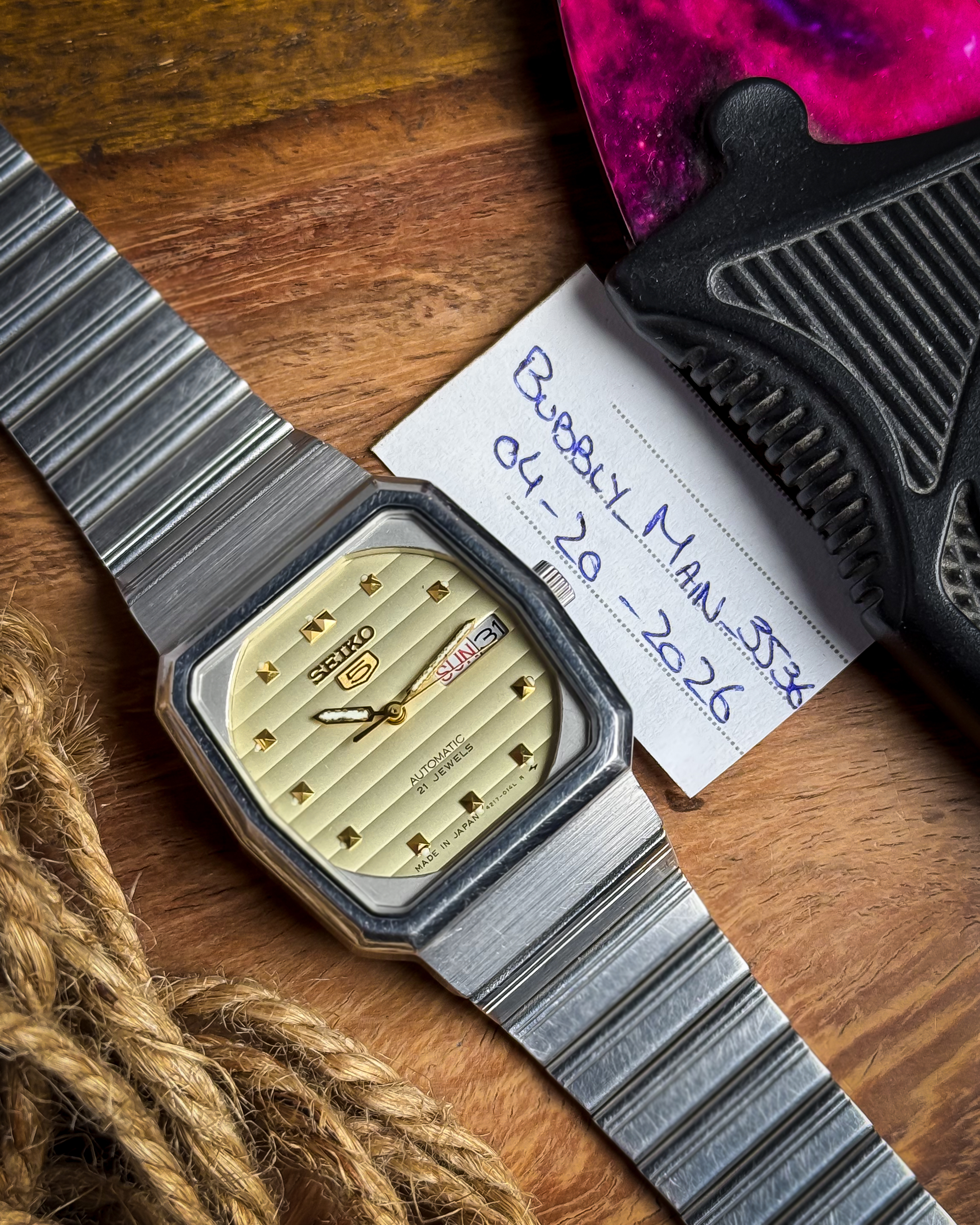 Thisย **August 1990 Seiko 5**ย is affectionately nicknamed theย **"Champagne Decagon."**ย The name stems from its rare, ten-sided decagonal caseโwhich provides a sophisticated alternative to the standard square, combined with the warm, radiant hue of its champagne dial. The dial itself is a masterclass in texture, featuringย **horizontal gradient lines**ย that catch and shift the light with every movement of the wrist. To add a striking three-dimensional effect, the face is adorned withย **gold-tone p...