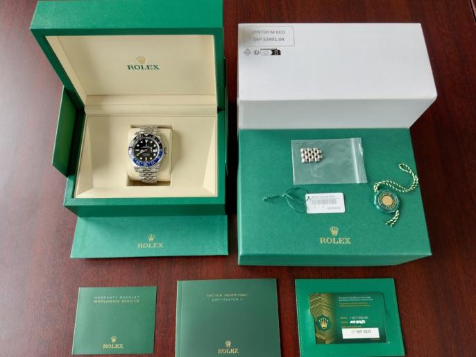 Rolex GMT Master II 126710 BLNR Jubilee Batman Batgirl for sale from my personal collection. Purchased Sept 2025 direct from AD. Brand new, completely unworn. Some factory stickers remain. Full complete set includes: New style green presentation box and green outer box, white sleeve, instruction manual, warranty booklet, leather warranty card holder, warranty card dated 09/2025, serialized hangtag, green Rolex hangtag. Bracelet sized to fit ~6.5” wrist; all removed links included. Price: $19...