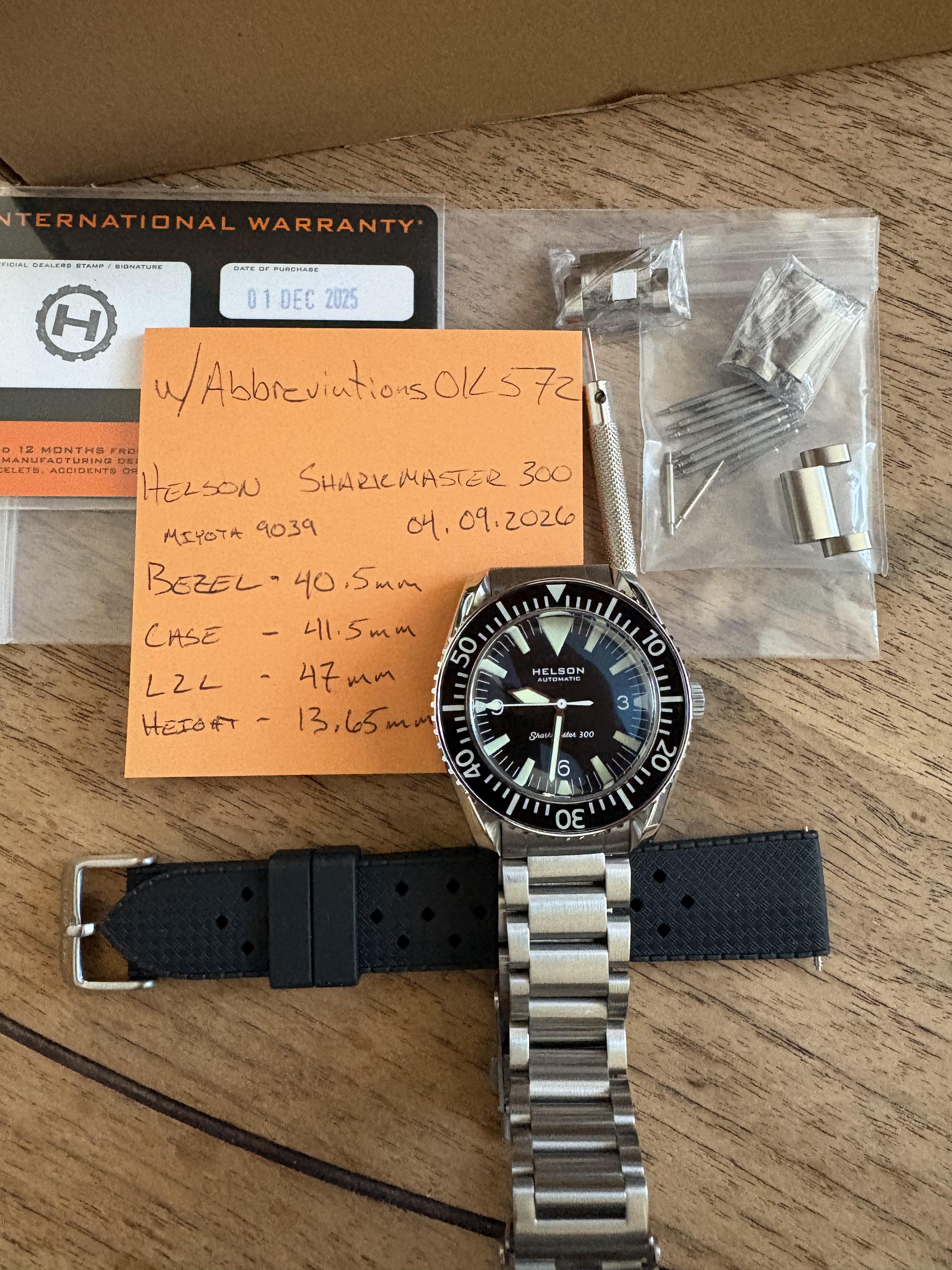 Hey WatchExchange! Up is my black Helson Sharkmaster 300 big triangle. Watch is in great shape, has some desk diving marks on the clasp. 41.5mm case with a 40.5mm bezel running a Miyota 9039 auto. Comes with all accessories: branded rubber strap, all spring bars for bracelet and strap, and warranty card. All bracelet links also included, I have one removed for 7” fit, plus two more links still in wrap. $450 shipped CONUS. Zelle or PayPal preferred. Always happy to FaceTime or send more pictur...