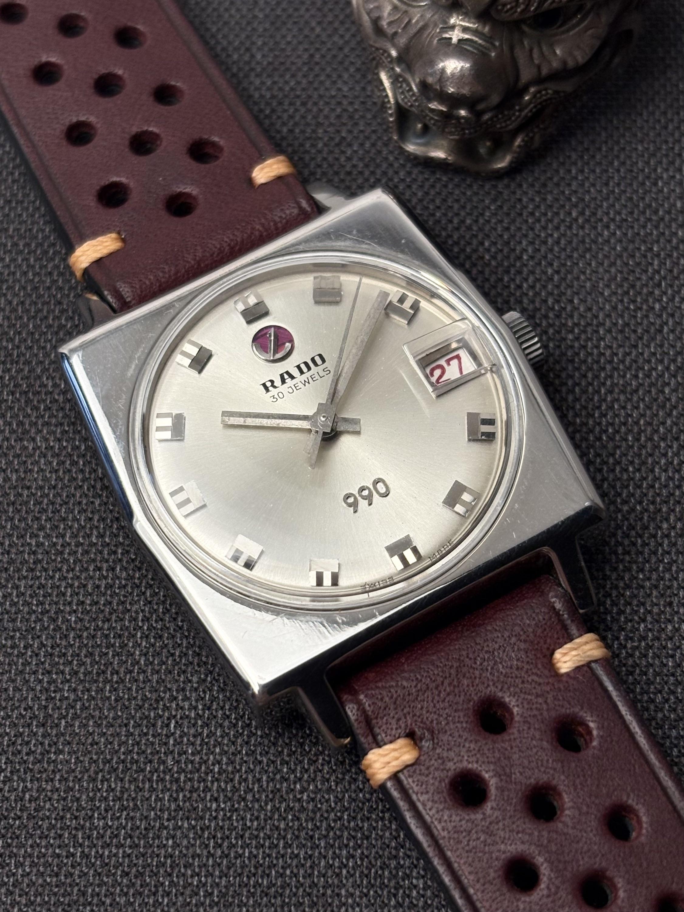 Up for sale is a rare Rado 990 30 jewels. The case design sits beautifully on the wrist while the silver sunburst dial adds a refined touch, complemented by a date window at 3 o’clock and the original signed crystal. A signature detail of Rado, the iconic anchor on the dial rotates smoothly with gentle movement, bringing the watch to life. The watch is fully serviced and is running well. 📐 Size 31x39,5mm. ⚙️ Automatic, Cal. 1858. ✅ Fully serviced. 🐮 High quality handmade rally cow strap, win...