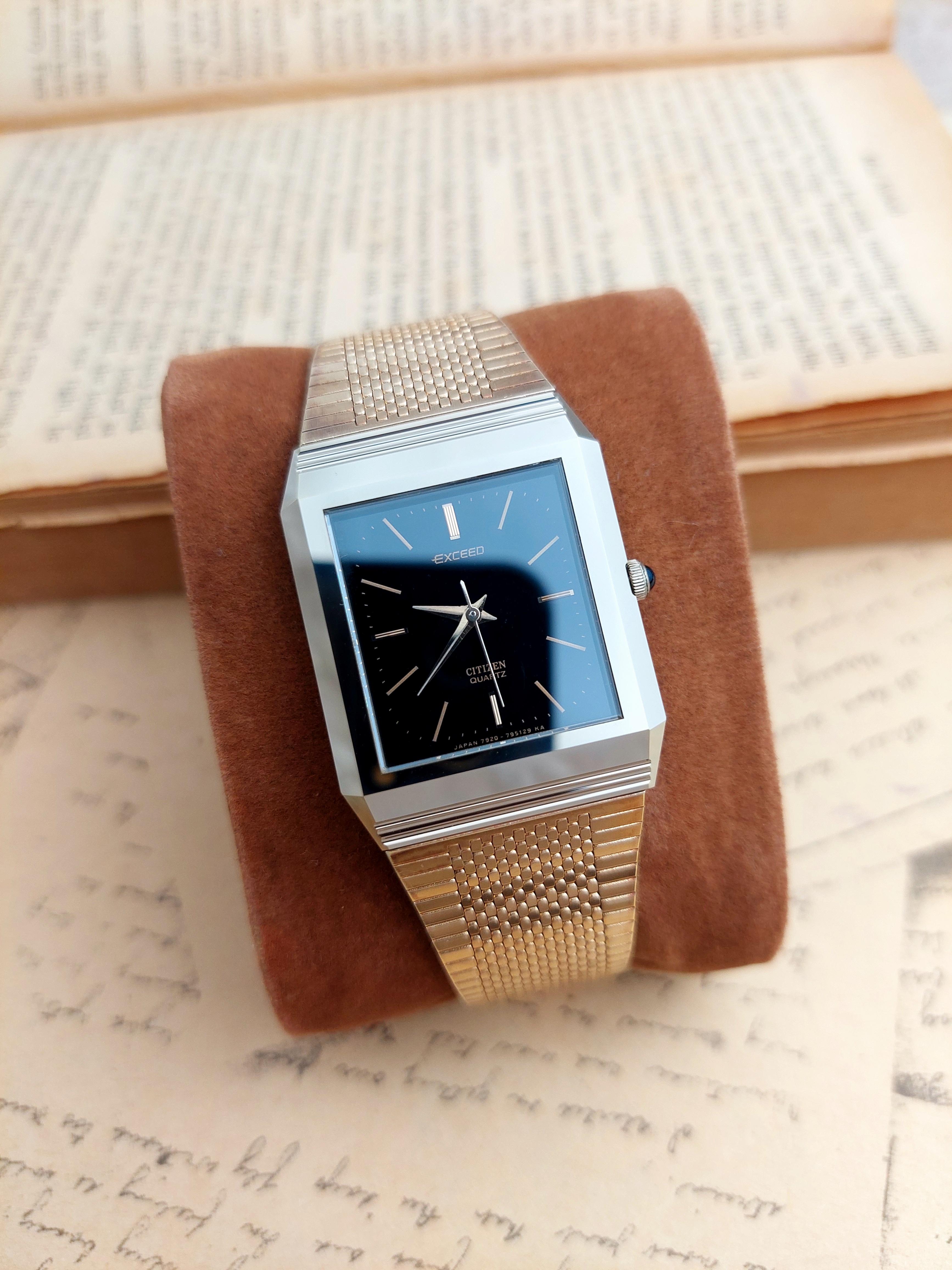 For sale an elegant vintage Citizen Exceed Ref No. 4-795725 K from 80's has ultra-hard alloys gold case (UHAG) case material which it has scratch-resistant case, high-hardness case that was designed to maintain a mirror-like polish for decades, far outperforming standard stainless steel of that era. The watch has a 29 mm case included crown, 34 mm lug-to-lug, fit up to wrist size 20 cm / 7.87 inch this watch also feature with saphire crystal which more resistance to scratches. Overall watch in ...