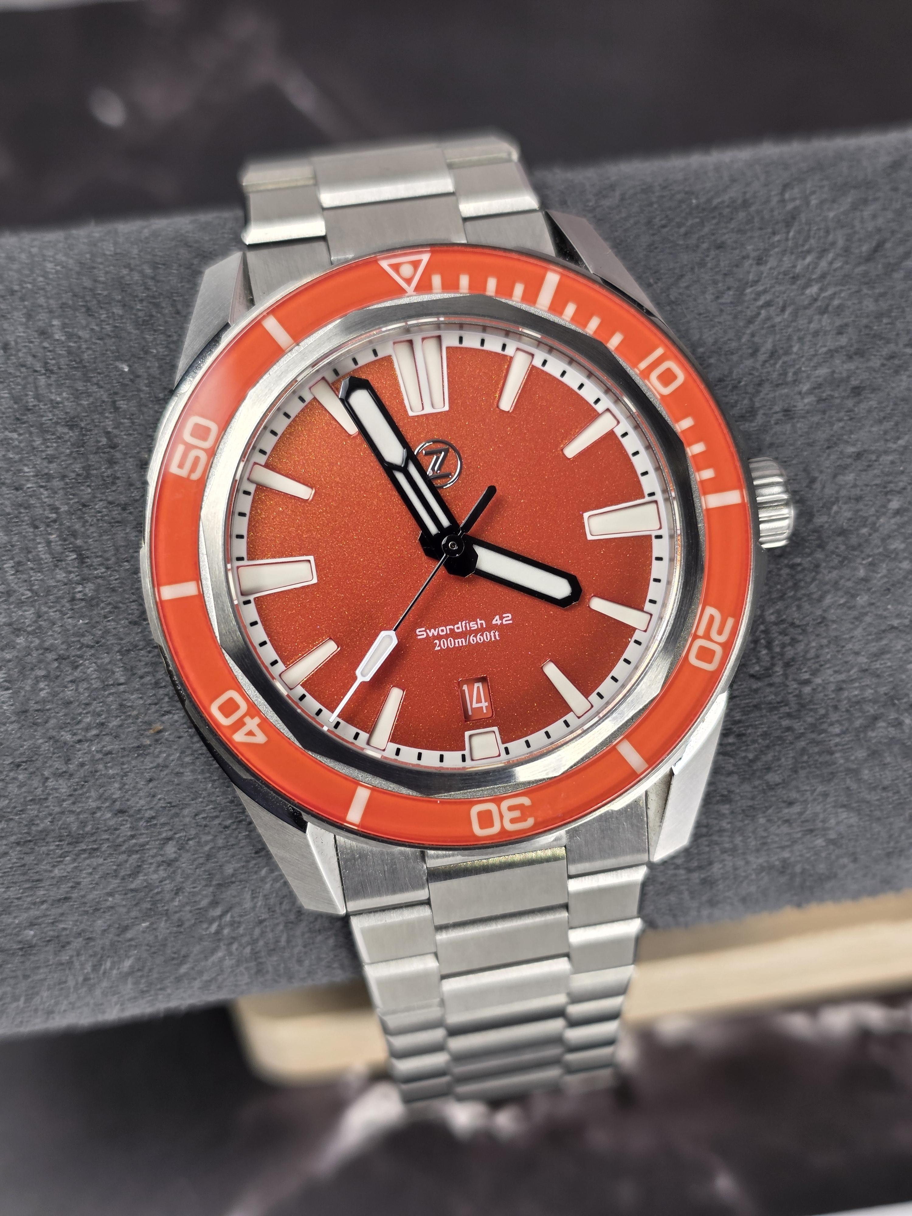 Zelos Swordfish 42 Spark Orange Great Pre-owned Condition Case: Very little wear Bezel: Clean Bracelet and Clasp: Short bracelet (~7.75"), little to no wear, some desk rash on clasp Crystal: Clean Box, travel pouch, and warranty card included $350 + shipping --- Add $ for label — Ships from NJ (CONUS only) Zelle preferred, PayPal & Venmo FF accepted NJ buyers subject to sales tax Additional photos & references available upon request