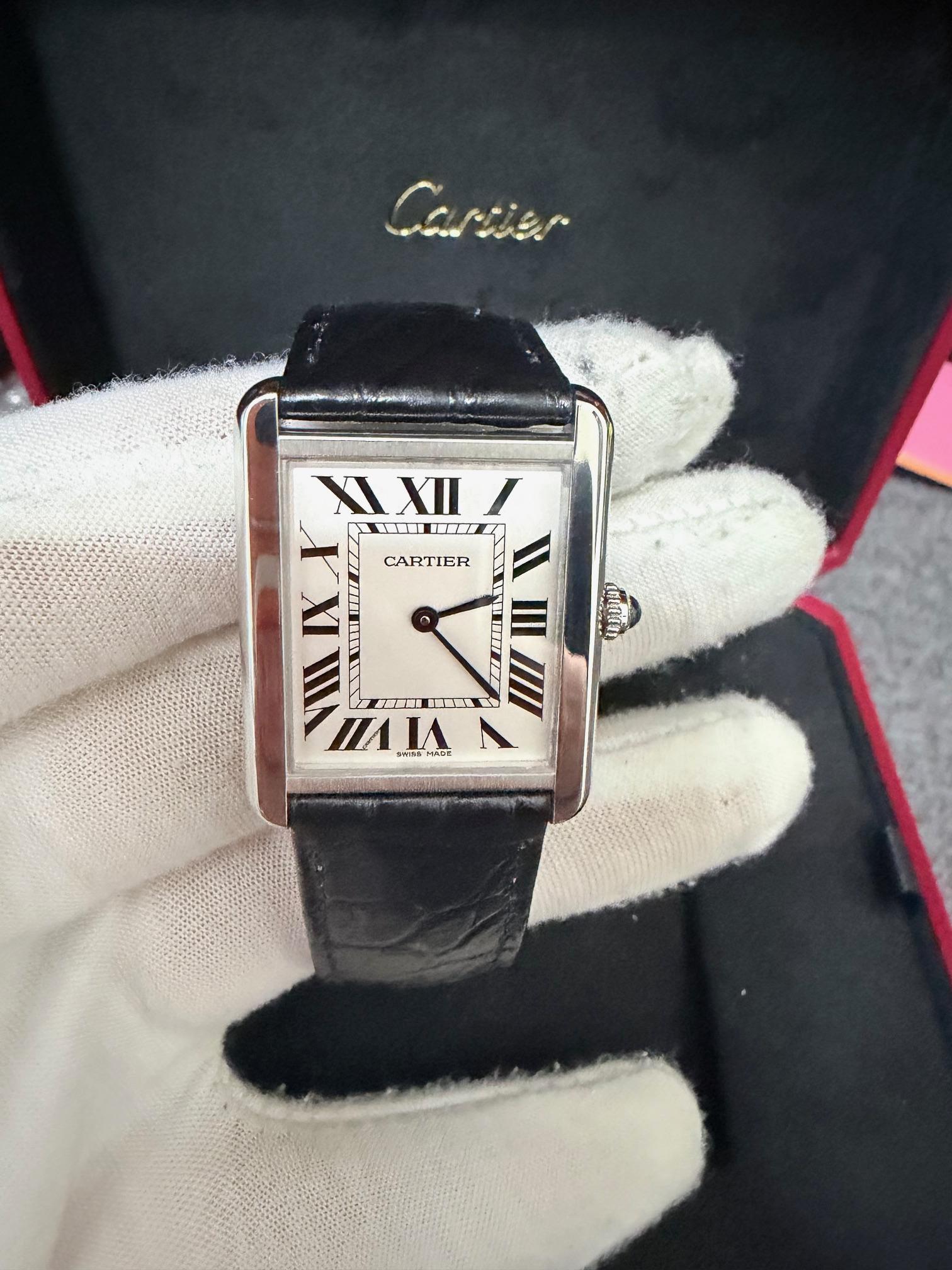 **F/S: Cartier Tank Solo Large 5/19 Ref: WSTA0028** **Shipping from Florida.** **Specs:** \* Elegant SS Case, blue steel sword shaped hands and Cartier’s beaded crown set with a blue cabochon-shaped spinel. \* 34.8mm x 27.4mm \* Black leather band with fold over clasp \* 30M Water Resistance \* Quartz movement **Includes**: Warranty card 5/19, inner box, booklet. **Condition:** Great preowned condition- a few superficial hairlines on the polished parts. Strap is great. Crystal is...
