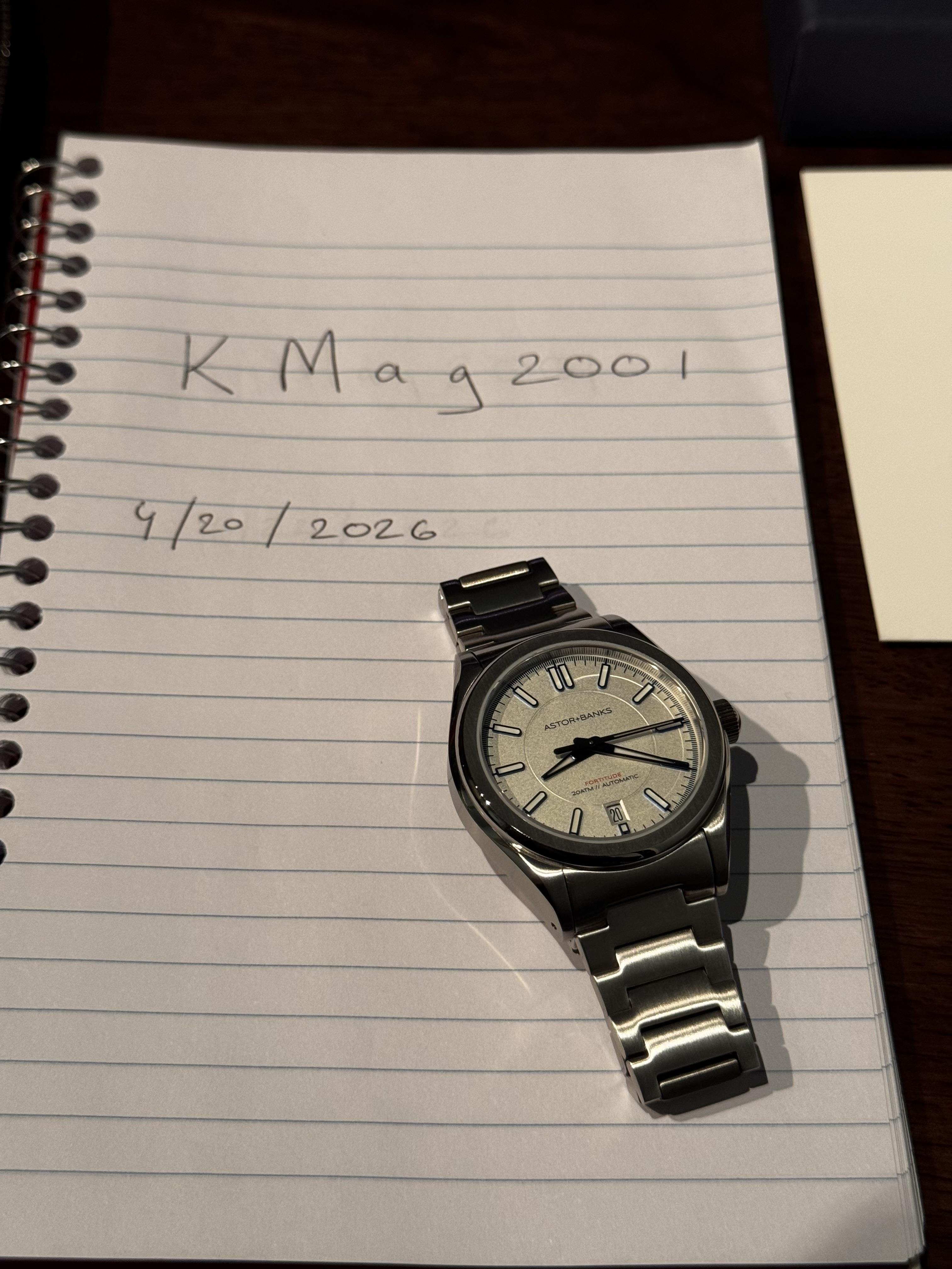 Repost. Price reduced to **$470 OBO (includes 2 day FEDEX shipping).** **Astor + Banks Fortitude Pro Silver.** \- Purchased new in December 2025 (still in warranty). \- Very accurate. Consistently running at -3.4s/day since purchased. \- Watch is great condition with minor signs of use. Case back has scratches - not sure where these have come from. Never abused and well maintained. \- Case, Box, Links, Tool, Warranty Card + Additional (unused) Strapsco Brown Leather Strap included. **...