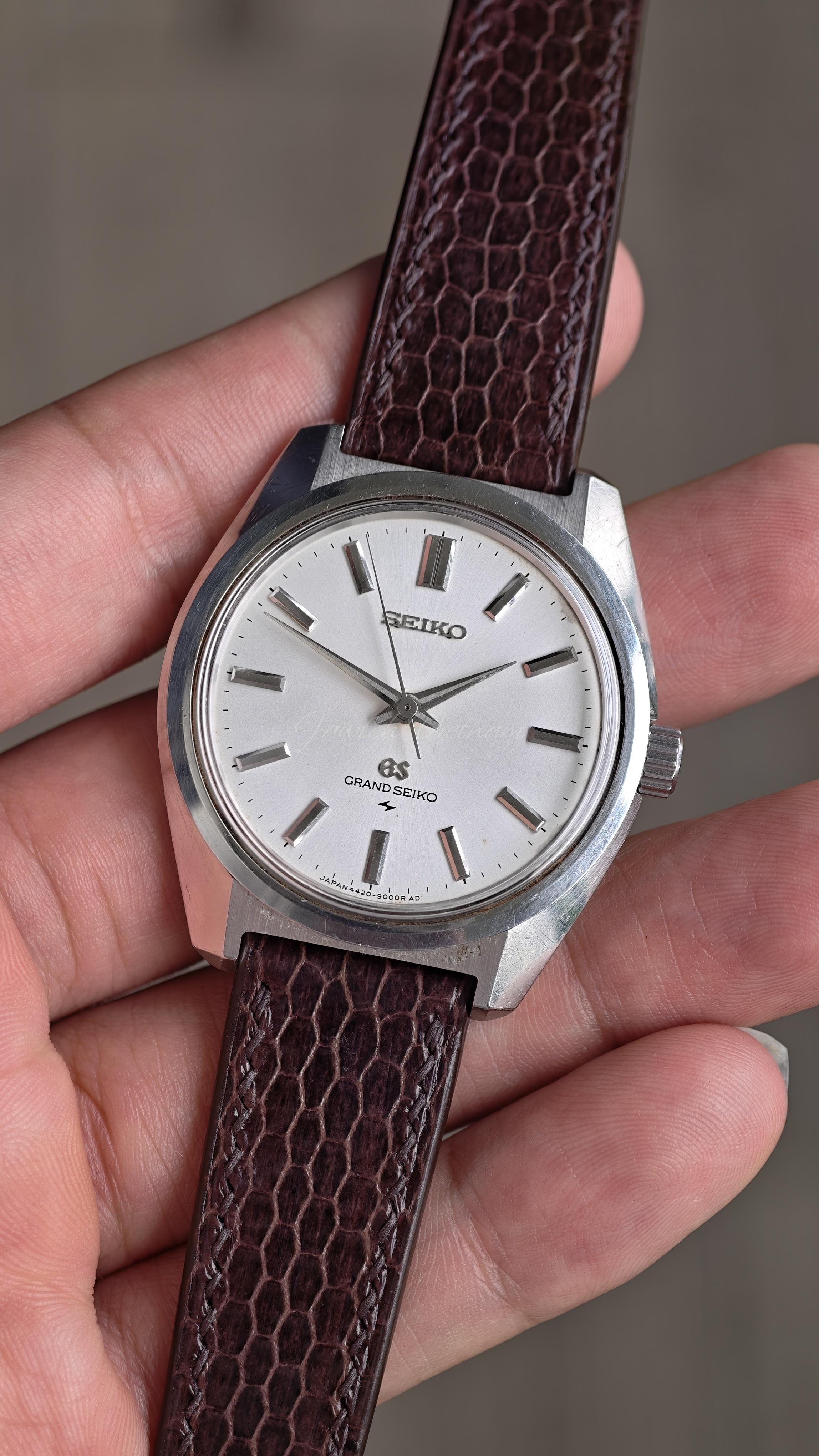 Hello r/Watchexchange. Up for sale is my Grand Seiko 4420-9000 cal.4420 manual winding. Very rare watch, a nearly perfect watch, the dial has a few minor stains from age. Details: • Grand Seiko 4420-9000 • Manual winding movement • Case size 37mm without crown. • Leather strap handmade, GS buckle. • Watch only, no box or papers Condition: • Overall good condition, case unpolished. • Light wear from normal use. • Serviced running very well, movement clean. • All original...