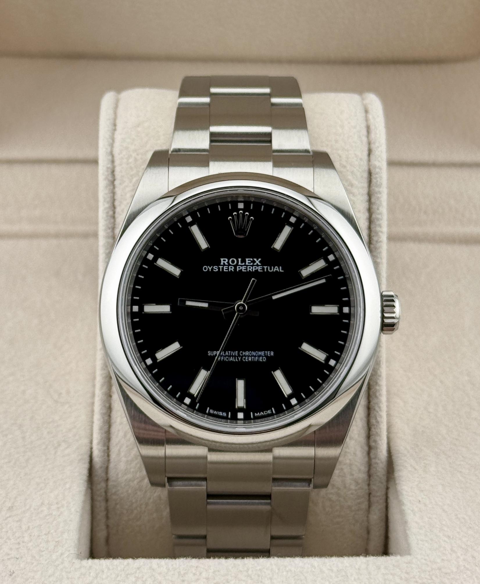 Rolex Oyster Perpetual 39 Reference: 114300 Case Size: 39mm Case Material: Steel Bracelet Material: Steel Crystal: Sapphire Movement: Automatic Calibre 3132 Box/Papers: Yes Age: Warranty Card Dated October 2019 / Rolex CPO Card Dated July 2025 This Rolex Oyster Perpetual 39 is in very good condition. It is the discontinued, 39mm reference featuring a black dial on a steel bracelet. It comes with boxes, booklets, original warranty card dated 10/28/2019, and Rolex CPO warranty card dated ...