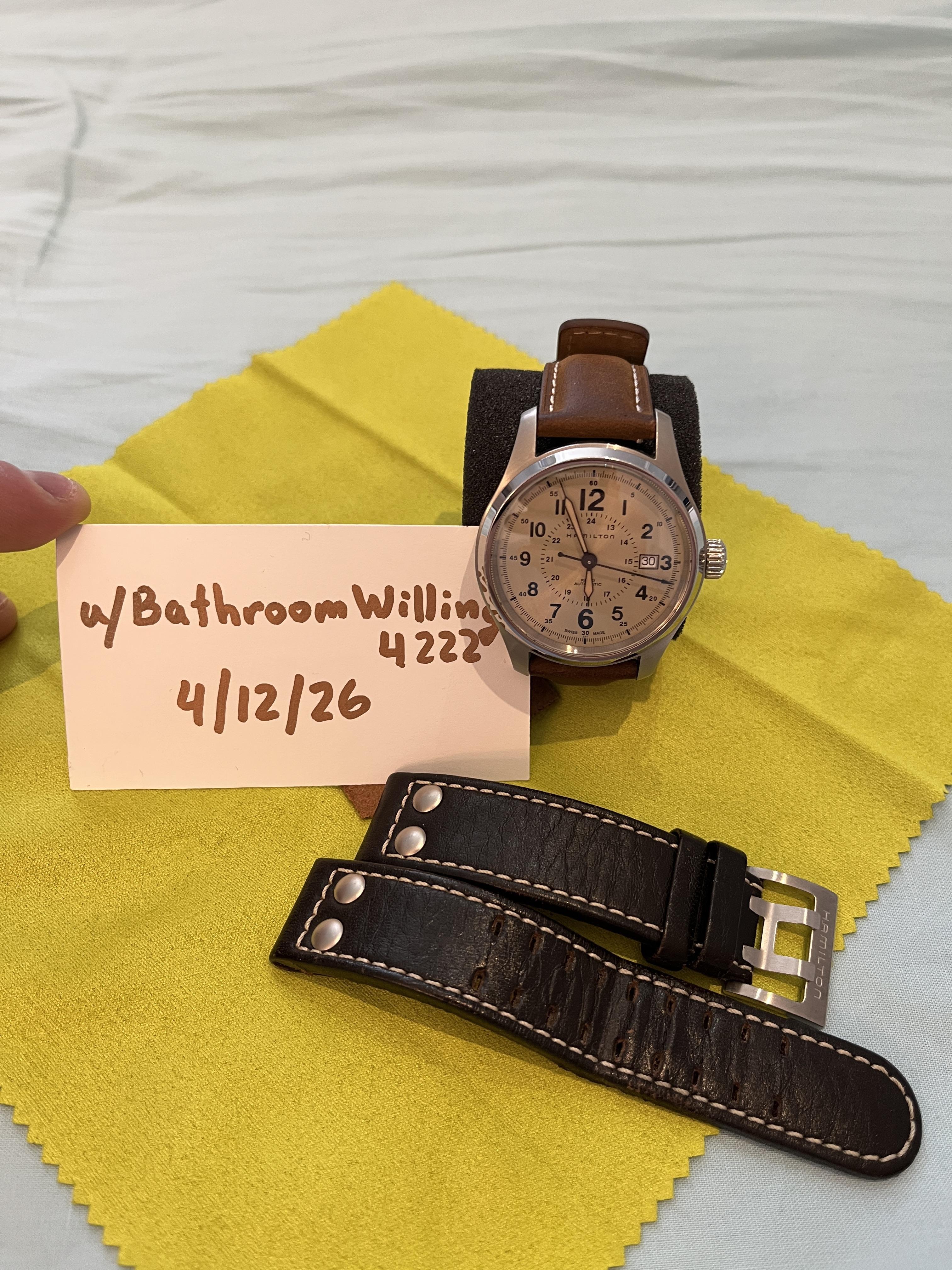 ![[WTS] Hamilton Khaki Field 40mm “old paper” dial with two leather straps in great condition - $425 Shipped CONUS.](https://sxdtrcenjzhqcznhokgy.supabase.co/storage/v1/object/public/reference-images/reddit/1sjlk9s.jpg)