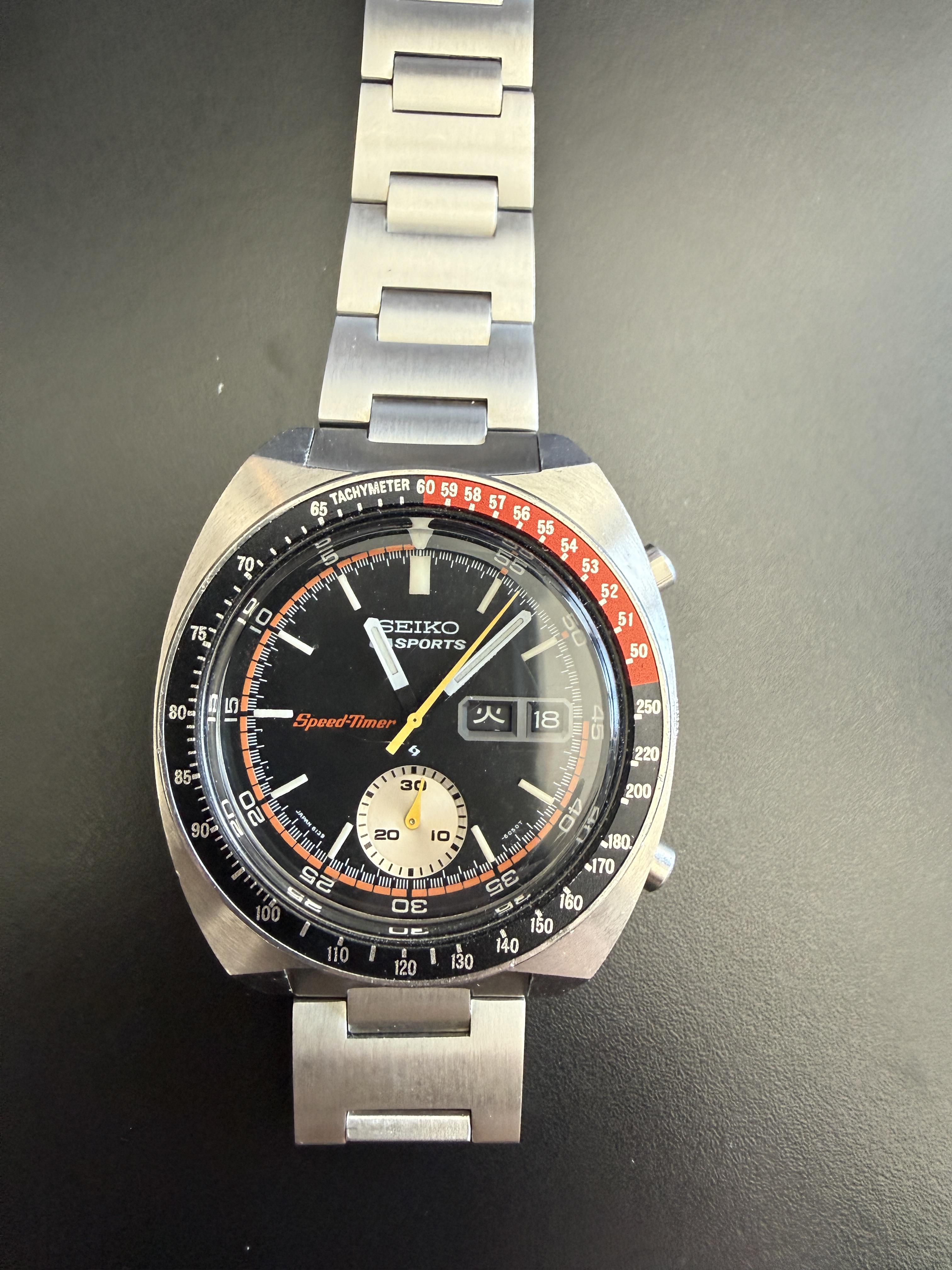 For Sale: Seiko Speedtimer 6139-6032 This one was serviced by Hub City vintage in January, 2024. I have the original service invoice and will provide that upon request and with the watch. This was serviced by the prior owner. It says that the crystal was replaced, day disk was repaired, and the day/date quickset rocker was replaced. Nothing really else to report but good condition with just the right amount of wear and fully functional. Timestamp: [https://www.dropbox.com/scl/fi/oycguhmh...