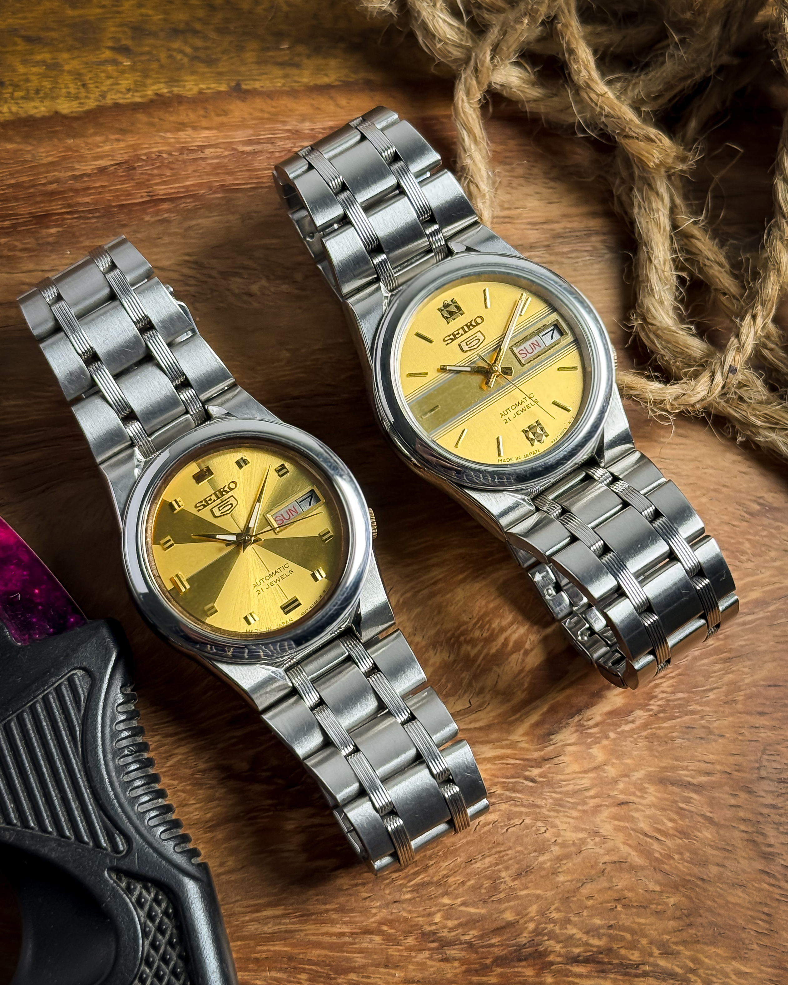 [Timetstamp](https://drive.google.com/file/d/1ZC8PcM_EeH9760yD1DcNLv5y84mpQcmE/view?usp=sharing) Up for sale is a rare pairing ofย **Seiko 5s from 1982**. These models are famous for theirย **integrated-style case shape**, which features a unique geometry that creates a seamless transition from the head to the bracelet. โย **Watch 1: "The Sunburst Ray"** The first piece features a mesmerizingย **Sunburst Ray Dial**. The pattern radiates from the center in a series of etched lines, mimicking t...