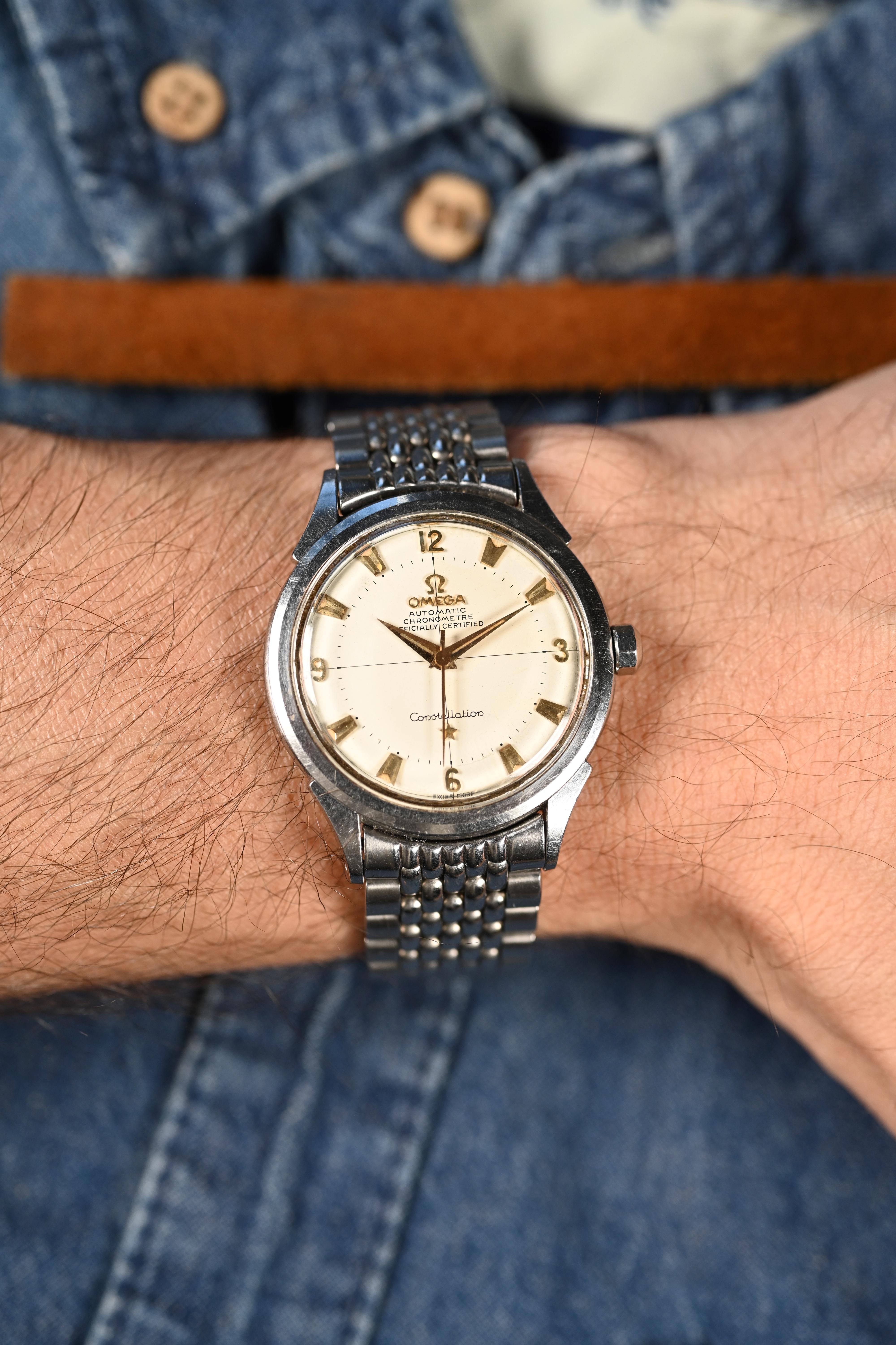 *Omega introduced its “Constellation” line in the early 1950’s starting with the reference 2648. The Constellation was Omega’s top-of-the-line model, offering chronometre certified bumper automatic movements and a medallion on the caseback depicting an observatory with 8 stars - each of which represent the 8 records omega set Geneva observatory trials.* *The reference 2782 is Omega's third generation Constellation model. Outwardly, it appears exactly like the more common reference 2852. Ho...