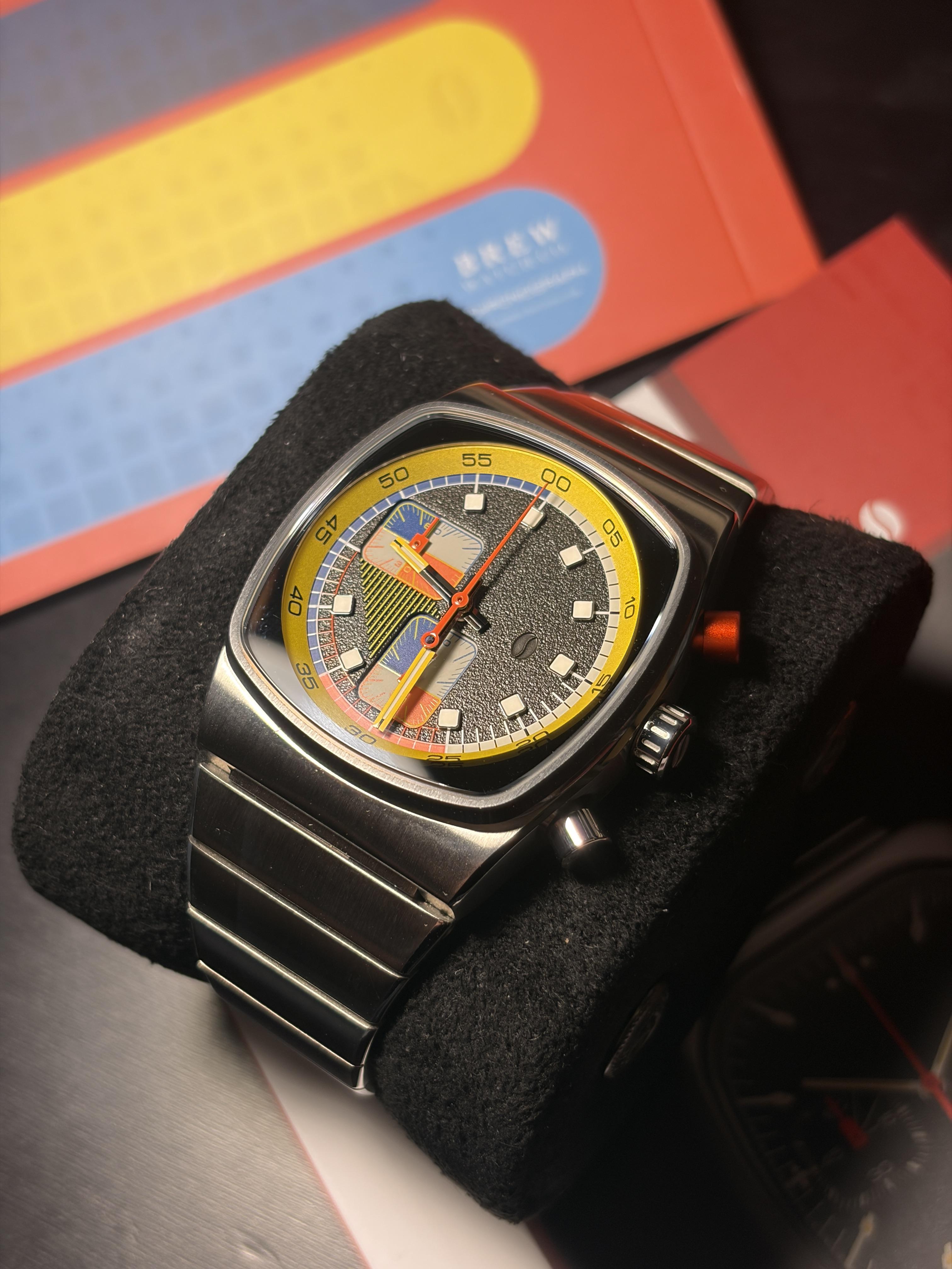 Up for sale: Brew Super Metric Lumina Yellow! Unworn, with box and papers. Featuring a beautiful black and yellow textured dial with multicolored subdials. The watch itself is in new condition, tried on once or twice with no signs of wear Full specs here: [Brew Super Metric](https://www.brew-watches.com/products/super-metric-lumina-yellow) Zelle/PayPal F&F $390 shipped CONUS