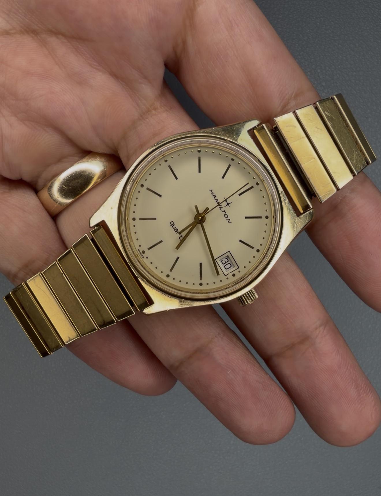 Vintage Men’s Hamilton 9058 w/ Cream Lacquered Dial in Gold Tone -Details: An absolutely beautiful vintage men’s Hamilton 9058 in gold tone with a cream lacquered dial. Has an elastic bracelet with a lot of life left! This piece measures 34mm but wears more like 36mm! In good condition, see the photos for yourself! -$250 shipped firm -Includes shipping (US). I accept Venmo, Zelle, CashApp, and PayPal (+4% if using G&S) -Case size: 34mm -Movement: Quartz -TikTok Review: https://www.tiktok.c...