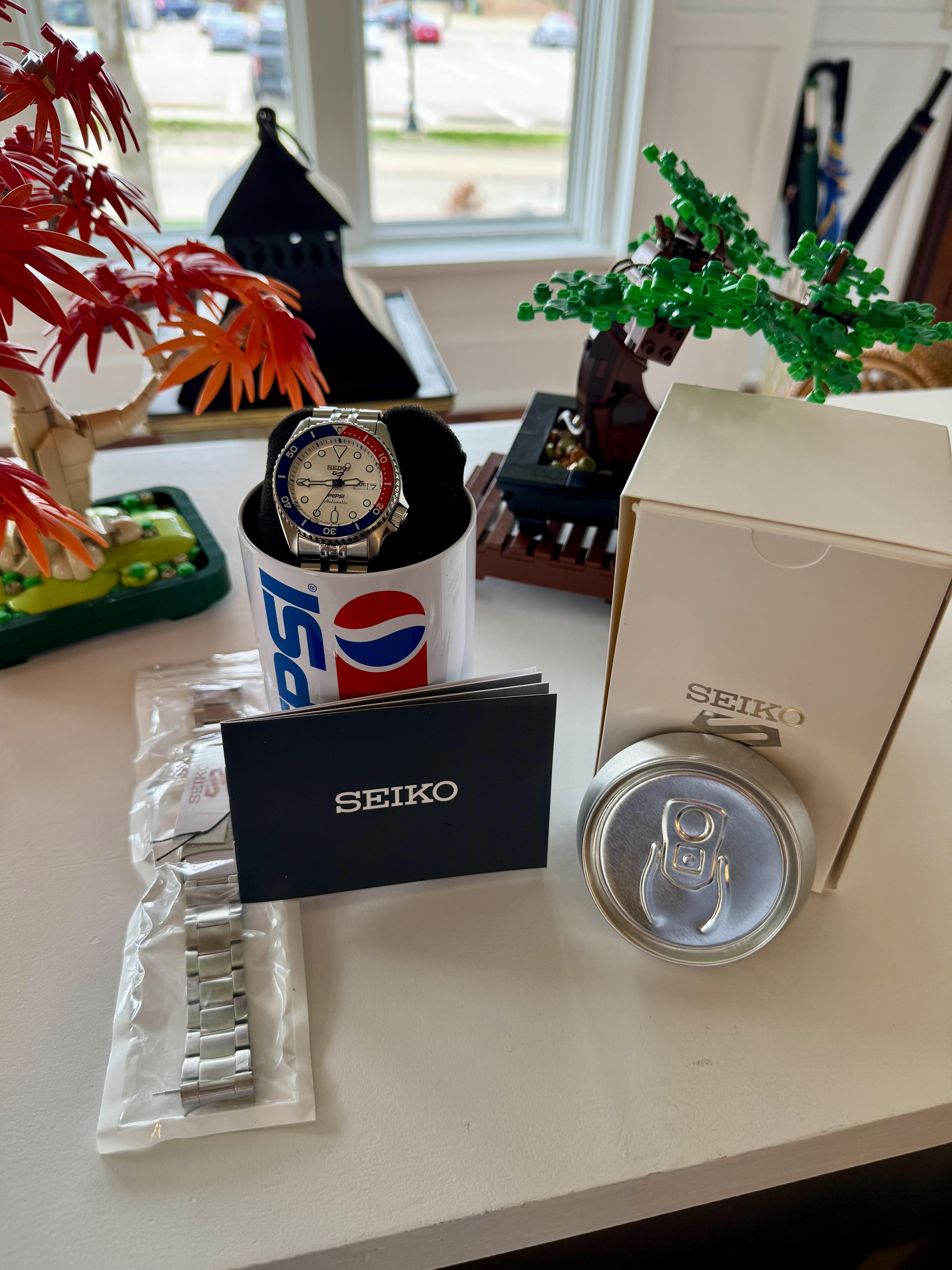 Up for sale is a Seiko Pepsi SRPL99 watch in like new, never worn (only tried on) condition. Full kit including original bracelet and StrapCode Jubilee bracelet. This limited-edition watch was a collaboration between Seiko and Pepsi even comes in a case shaped like a Pepsi can. The watch is sold out everywhere and is sure to become a collectors’ item. The only reason I’m selling this watch is to make room for a new addition. Timestamp included in photos. Asking $695 plus shipping Payment: Z...